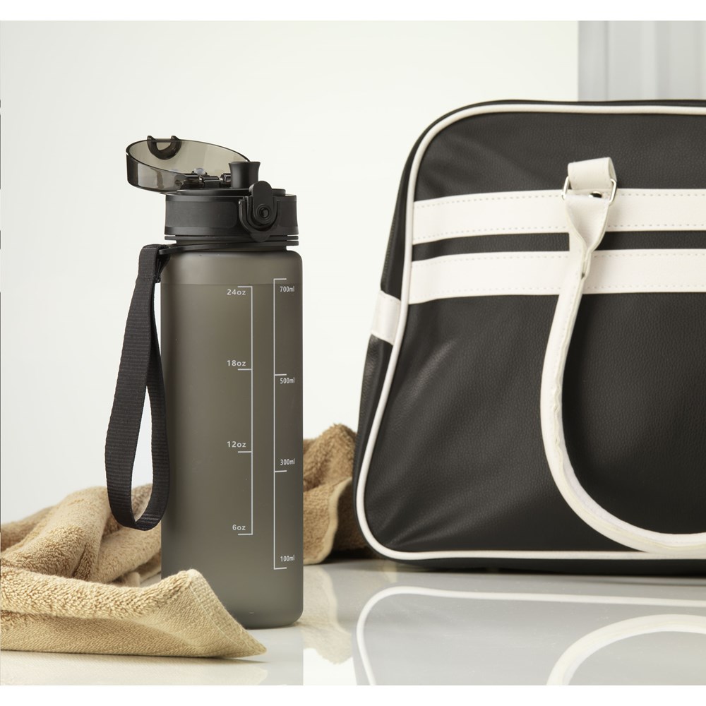 Matt transparente Kunststoff-Wasserflasche mit auslaufsicherem Schraubverschluss und praktischer Trageschlaufe. Der Schraubverschluss hat eine Trinktülle und ist mit einem transparenten Deckel mit Druckknopf und Verschluss hygienisch verschlossen. Mit Inhaltsangabe in ml und oz auf der Außenseite der Flasche. Nicht spülmaschinengeeignet. Fassungsvermögen 750 ml.