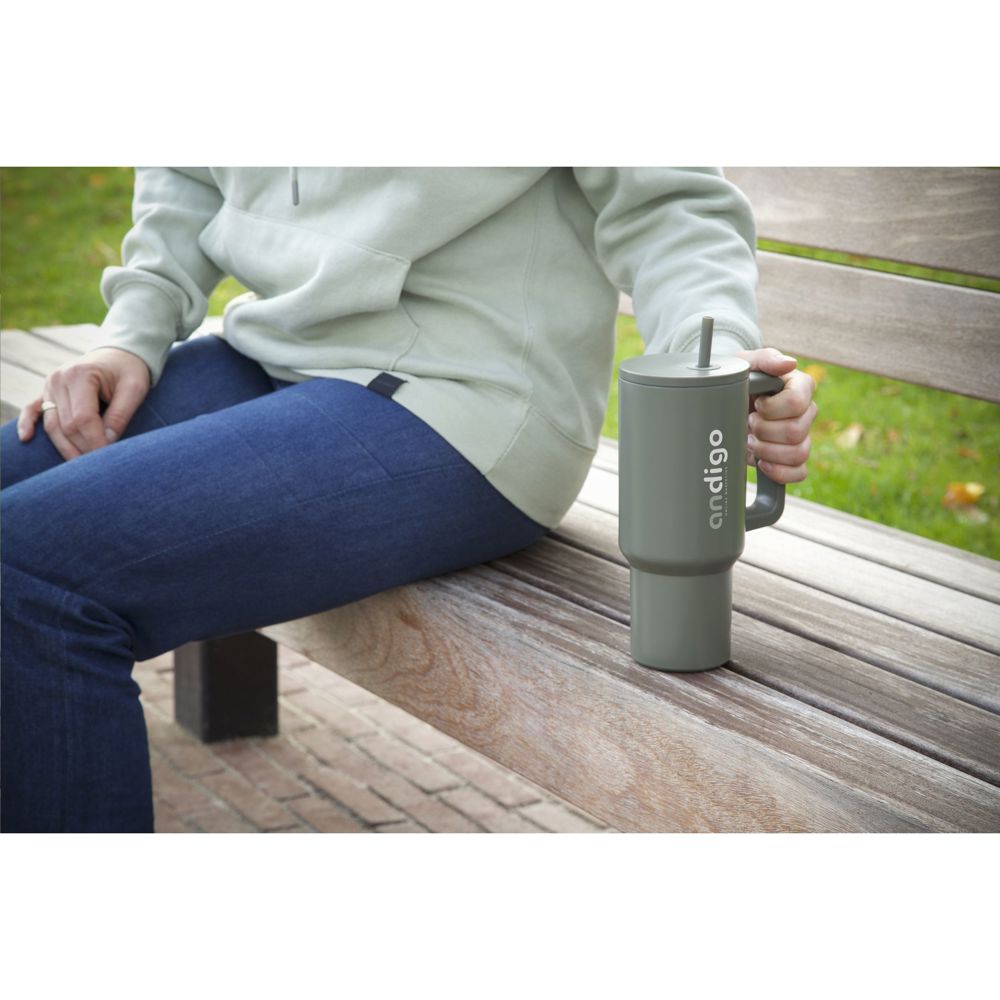 Großer, doppelwandiger Trinkbecher aus recyceltem Edelstahl mit Strohhalm. Der auffällige, robuste Becher hat einen großen Kunststoffgriff und einen Schraubdeckel mit einer Öffnung für den mitgelieferten Kunststoffstrohhalm. Dieser große Becher hält Getränke über längere Zeit auf Temperatur. Geeignet für kalte und heiße Getränke. Auch ohne Strohhalm geht die Temperatur dank der Silikondichtung im Deckel nicht verloren. Dieser Becher kann überall hin mitgenommen werden. Ideal für das Fitnessstudio oder das Büro. Dank des konischen, schmalen Bodens passt der Becher in fast jeden Becherhalter und ist somit perfekt für unterwegs. Nicht spülmaschinengeeignet. RCS-zertifiziert. Gesamtes recyceltes Material: 75%. Fassungsvermögen: 900 ml. Verpackt pro Stück.