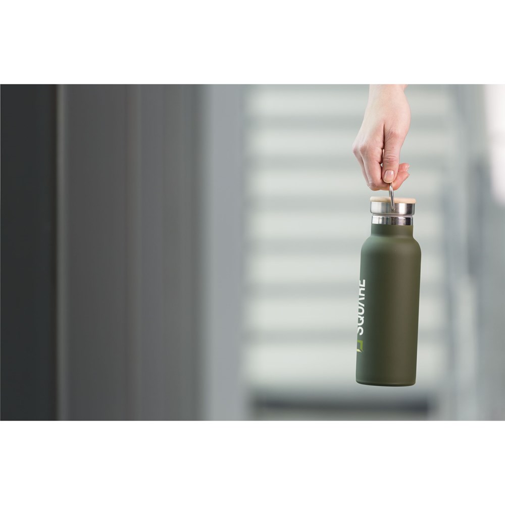 Doppelwandige, auslaufsichere Wasserflasche/Thermoflasche aus recyceltem Edelstahl. Vakuumisoliert. Der praktische Schraubverschluss ist eine Kombination aus Edelstahl und Bambus. Geeignet zur Temperaturerhaltung von kalten oder heißen Getränken. Entwurf basiert auf der Vintage-Milchflasche aus Glas. Nicht spülmaschinengeeignet. RCS-zertifiziert. Gesamtes recyceltes Material: 79%. Fassungsvermögen 500 ml. Edelstahl kann viele Male recycelt werden – die Qualität des Materials bleibt dabei weitgehend erhalten. Durch die Verwendung von recyceltem Edelstahl kommt eine geringere Menge an neuen Rohstoffen zum Einsatz. Das bedeutet weniger Energieverbrauch und weniger Wasserverbrauch. Verpackt pro Stück.
