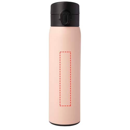 Elegante, RCS-zertifizierte Isolierflasche aus recyceltem Edelstahl mit einfachem Öffnungsmechanismus per Knopfdruck. Die Flasche ist auslaufsicher, und dank der Kupfer-Vakuumisolierung bleiben die Getränke mehrere Stunden lang heiß oder kalt. Das Fassungsvermögen beträgt 450 ml. Verpackt in einer Geschenkbox aus Recyclingkarton.