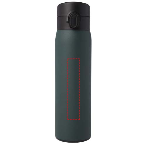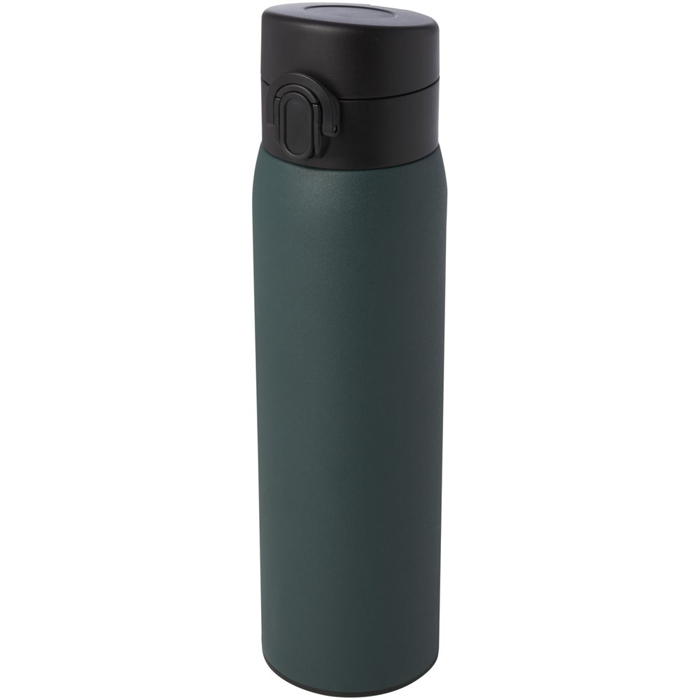 Elegante, RCS-zertifizierte Isolierflasche aus recyceltem Edelstahl mit einfachem Öffnungsmechanismus per Knopfdruck. Die Flasche ist auslaufsicher, und dank der Kupfer-Vakuumisolierung bleiben die Getränke mehrere Stunden lang heiß oder kalt. Das Fassungsvermögen beträgt 450 ml. Verpackt in einer Geschenkbox aus Recyclingkarton.