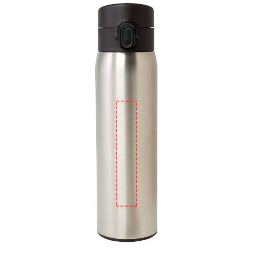 Elegante, RCS-zertifizierte Isolierflasche aus recyceltem Edelstahl mit einfachem Öffnungsmechanismus per Knopfdruck. Die Flasche ist auslaufsicher, und dank der Kupfer-Vakuumisolierung bleiben die Getränke mehrere Stunden lang heiß oder kalt. Das Fassungsvermögen beträgt 450 ml. Verpackt in einer Geschenkbox aus Recyclingkarton.