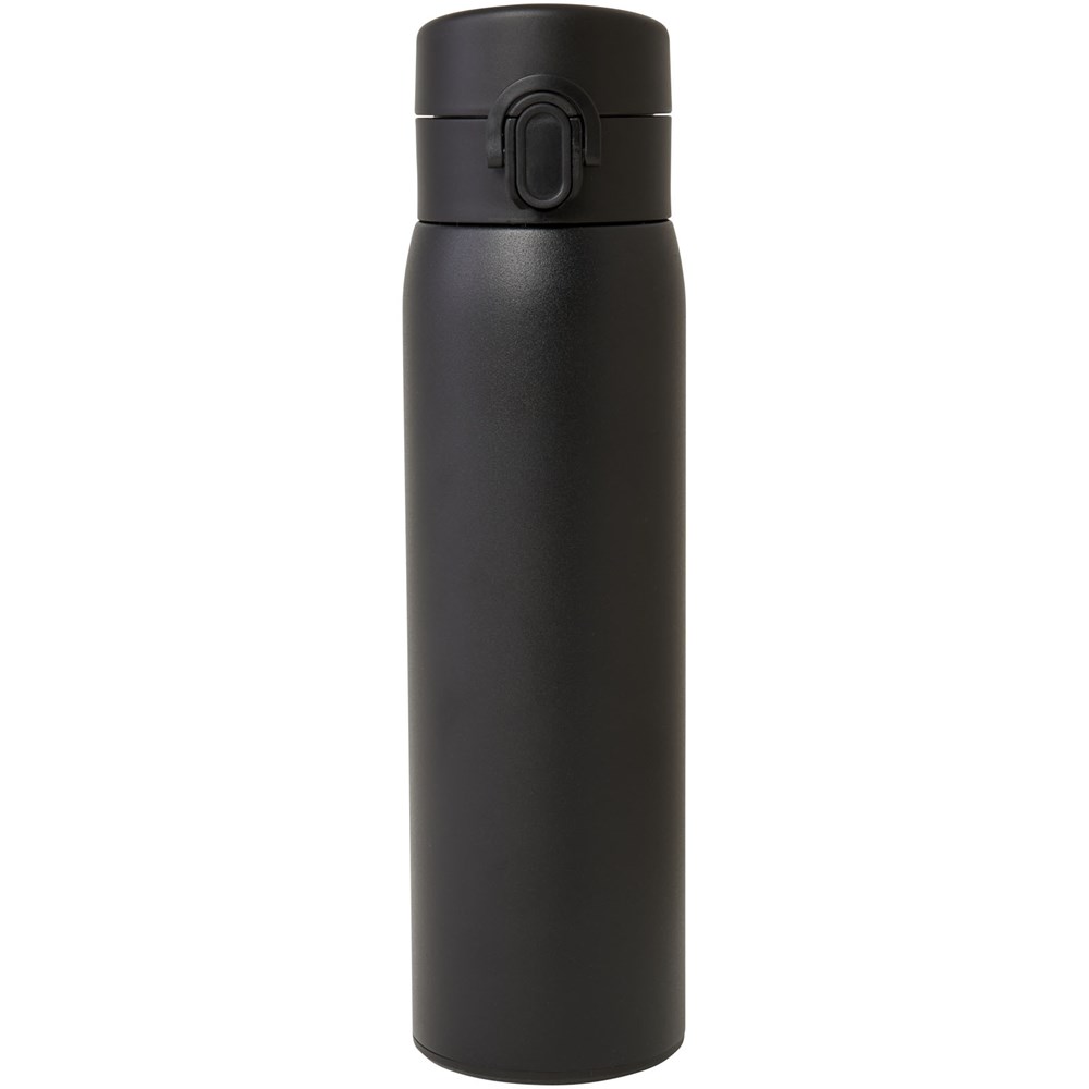 Elegante, RCS-zertifizierte Isolierflasche aus recyceltem Edelstahl mit einfachem Öffnungsmechanismus per Knopfdruck. Die Flasche ist auslaufsicher, und dank der Kupfer-Vakuumisolierung bleiben die Getränke mehrere Stunden lang heiß oder kalt. Das Fassungsvermögen beträgt 450 ml. Verpackt in einer Geschenkbox aus Recyclingkarton.