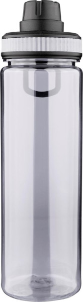 Trinkflasche aus rPET (750 ml) mit PP-Deckel, Tragegriff und Schraubverschluss. Der Deckel verfügt über farbige Silikondetails, die zum transparenten Flaschenkörper passen.