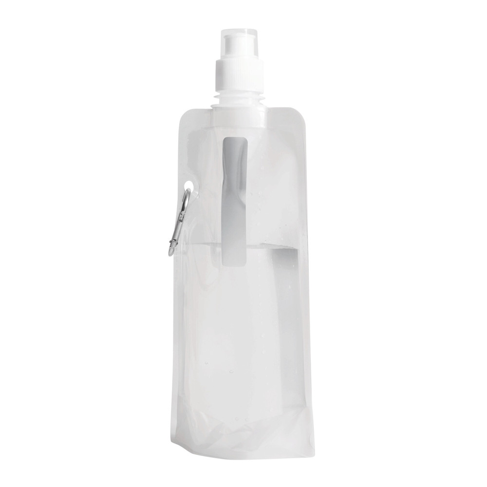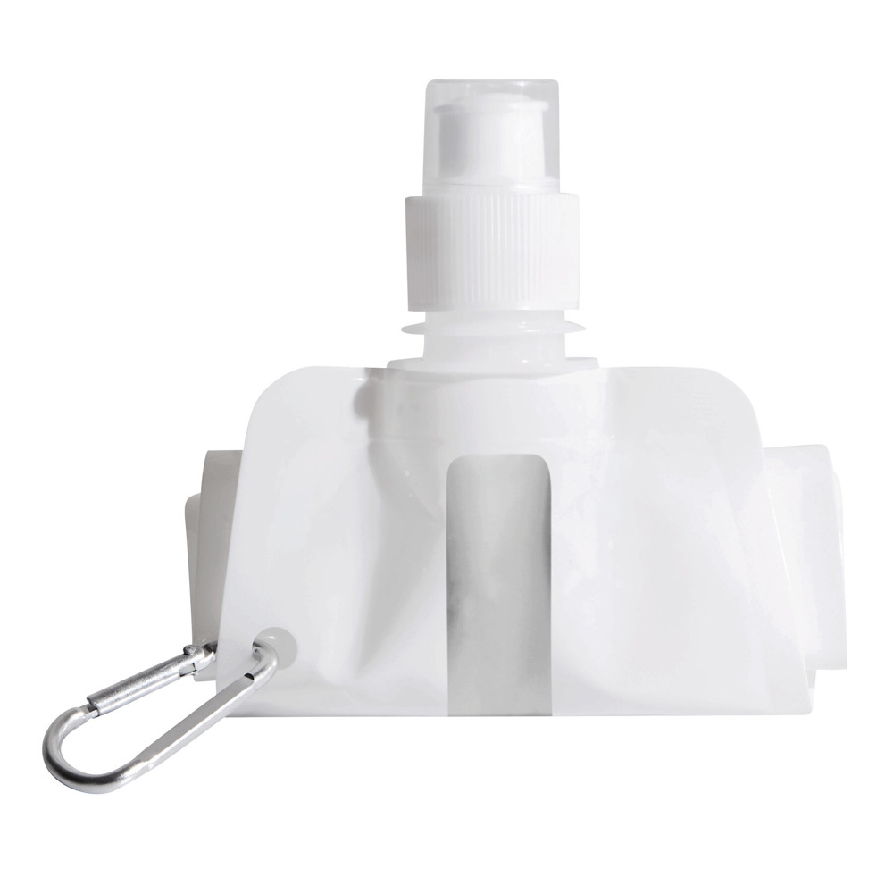 Trinkflasche AQUAFOLD: falt-, bzw. rollbar im ungefüllten Zustand, transparente Verschlusskappe, mit Karabinerhaken (der Karabiner ist NICHT als Sicherung beim Klettern geeignet), Füllmenge ca. 400 ml