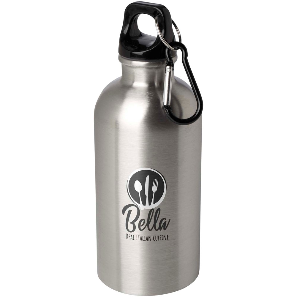 Mit dieser robusten und dennoch leichten 400 ml Trinkflasche aus RCS-zertifiziertem, recyceltem Edelstahl sind Sie immer gut mit Flüssigkeit versorgt. Sie ist der perfekte Begleiter beim Sport, auf Tagesausflügen oder im Büro. Die einwandige Oregon Flasche hat einen Drehverschluss und bietet viel Platz für ein Logo Ihrer Wahl. Der mitgelieferte Karabinerhaken (nicht zum Klettern geeignet) kann sicher an einer Tasche befestigt werden, damit die Flasche nicht verloren geht.