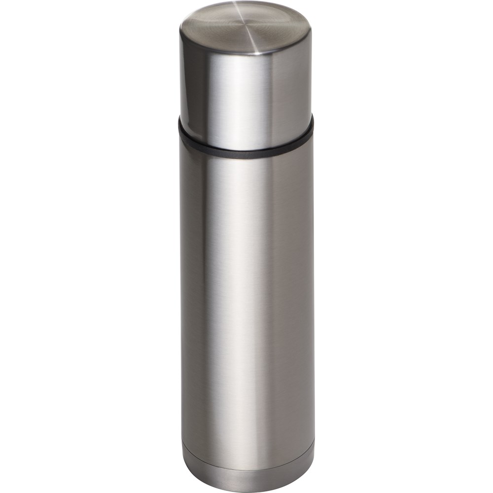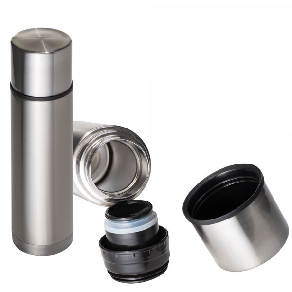 Doppelwandige, auslaufsichere Vakuum Isolierkanne aus Edelstahl (Fassungsvolumen 500 ml) mit Schnellverschluss und einem integrierten Becher. Ihre Werbung wird mittels Lasergravur angebracht.