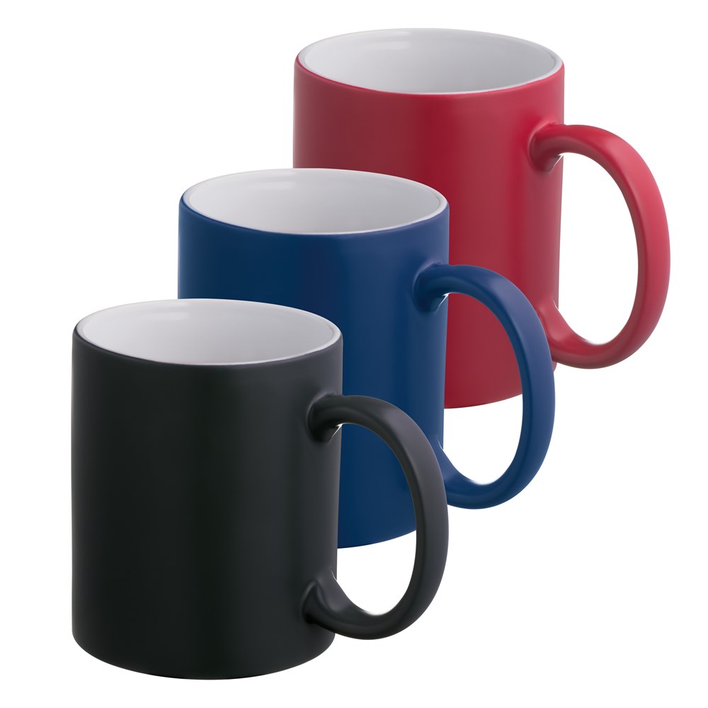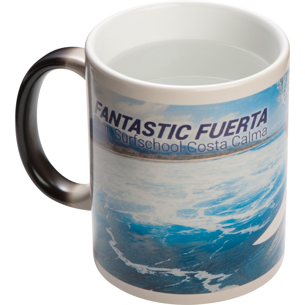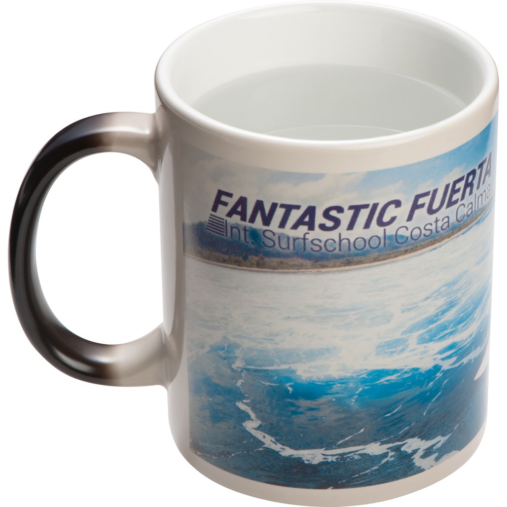 It's magic! Tasse aus Keramik (Fassungsvolumen 300 ml) mit Colour-Changing-Effekt. Hier verschwindet im kalten Zustand der Druck unter der farbigen Lackierung - Sobald heiße Flüssigkeit eingefüllt wird, erscheint Ihr Druck. Ihre Werbung bringen wir rundherum auf der Tasse an. Um die Brillanz des Druckbildes zu erhalten, empfehlen wir Handwäsche.