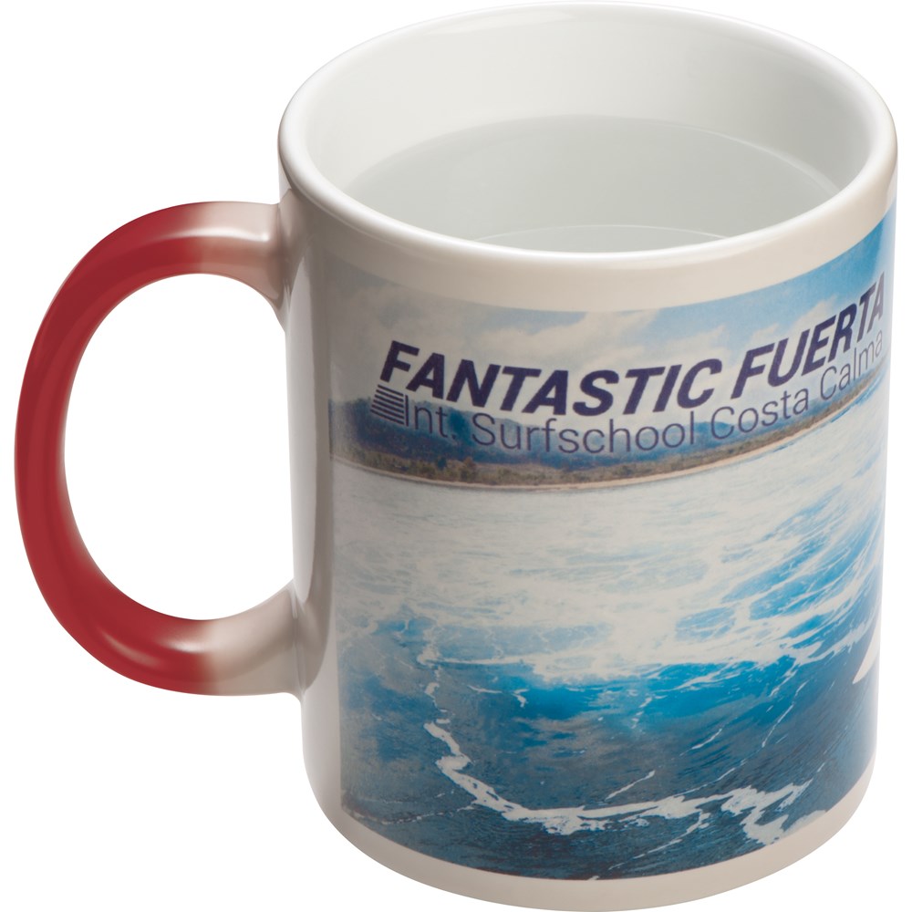 It's magic! Tasse aus Keramik (Fassungsvolumen 300 ml) mit Colour-Changing-Effekt. Hier verschwindet im kalten Zustand der Druck unter der farbigen Lackierung - Sobald heiße Flüssigkeit eingefüllt wird, erscheint Ihr Druck. Ihre Werbung bringen wir rundherum auf der Tasse an. Um die Brillanz des Druckbildes zu erhalten, empfehlen wir Handwäsche.