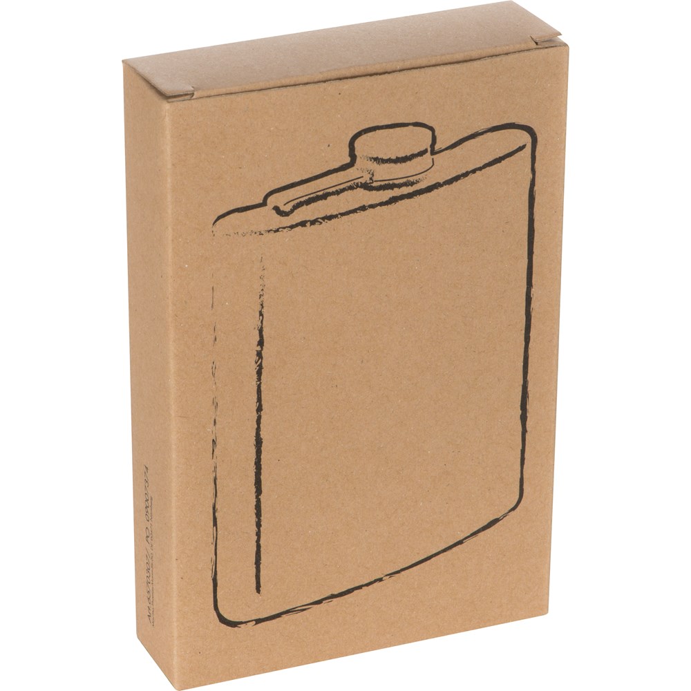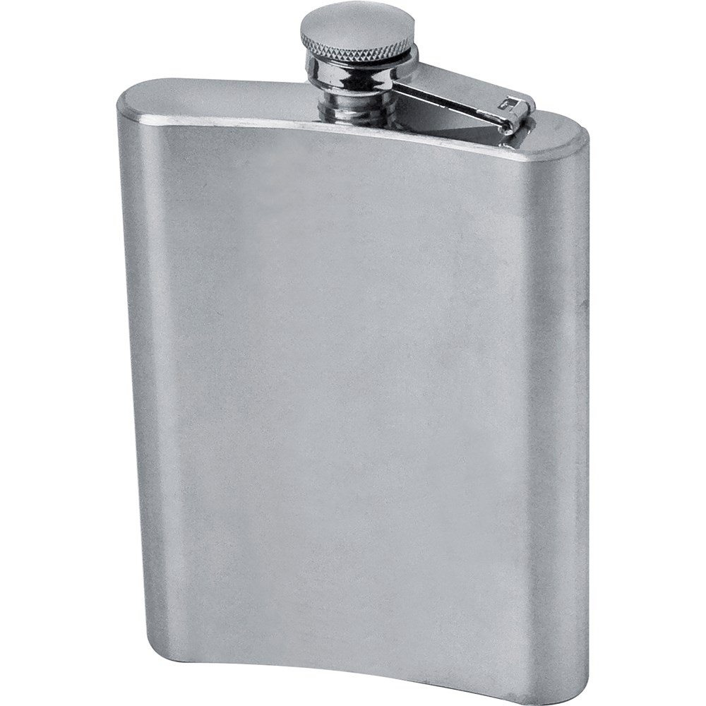 Flachmann (Fassungsvolumen 237 ml) aus Edelstahl mit Sicherheits-Drehverschluss. Ihr Werbung wird auf den Flachmann gelasert.