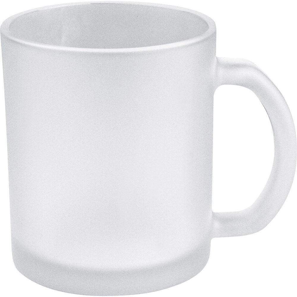 Kaffeebecher aus Glas (Fassungsvolumen 300 ml) in transparent gefrosteter Optik. Ihre Werbung bringen wir mittels Keramiktransfer links oder rechts vom Henkel an.
