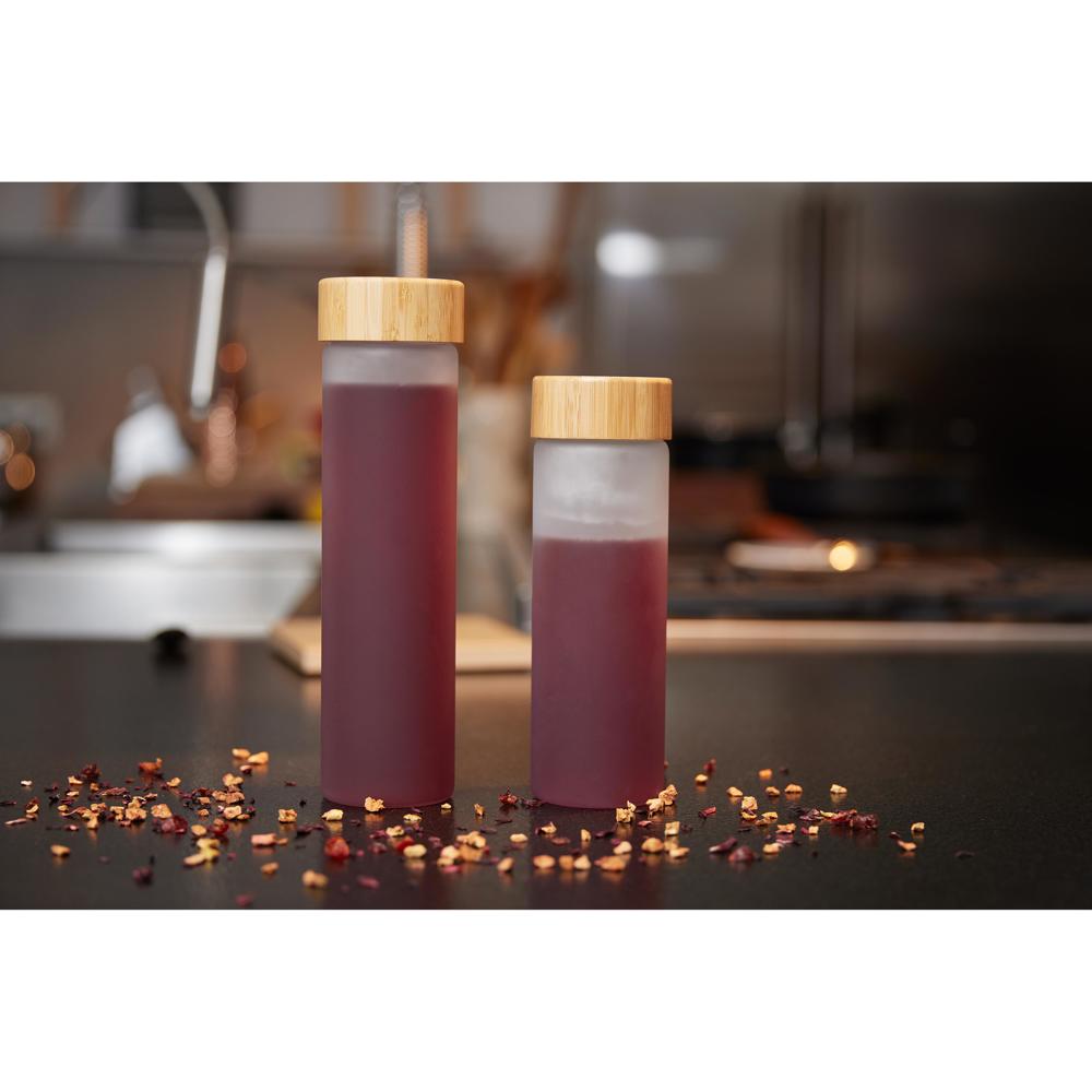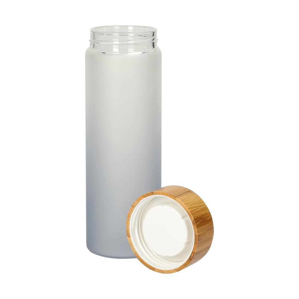 Flasche mit dem besonderen Effekt. Diese Flasche aus hochwertigem Borosilikat-Glas verfügt über einen dezenten matten Farbverlauf, was sie zu einem echten Hingucker macht. Der Schraubdeckel aus Bambus verleiht der Flasche einen natürlichen Look. Füllmenge: 0,55 Liter.
