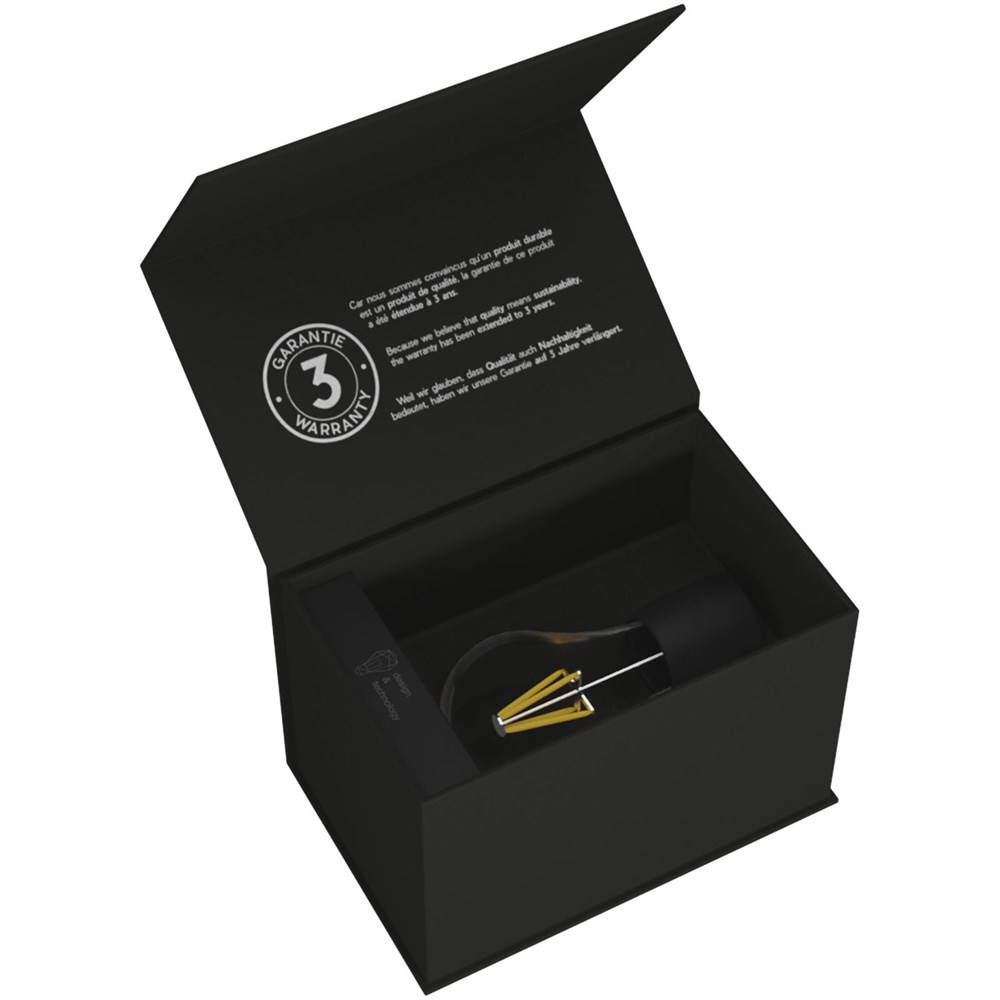 Elegante Schwebelampe, die auf jedem Schreibtisch gut aussieht. Die Lampe besitzt einen Soft-Touch-Gummisockel mit einem individuell gestaltbaren, leuchtenden Logo. Die leistungsstarke Magnettechnik hebt die Glühbirne an und hält sie auf dem Sockel schwebend. Die Glühbirne wird über einen Knopf am Sockel der Lampe ein- und ausgeschaltet. Maximale Leistung: 130 Lumen. Die Lampe ist 12 x 12 x 16 cm groß und wird in einer schwarzen Geschenkbox mit Magnetverschluss (18,5 x 13 x 13 cm) verpackt. Inklusive 3 Jahre Garantie.