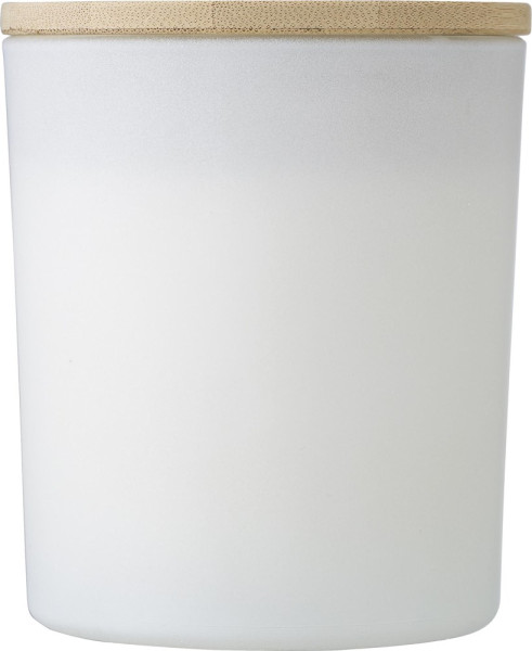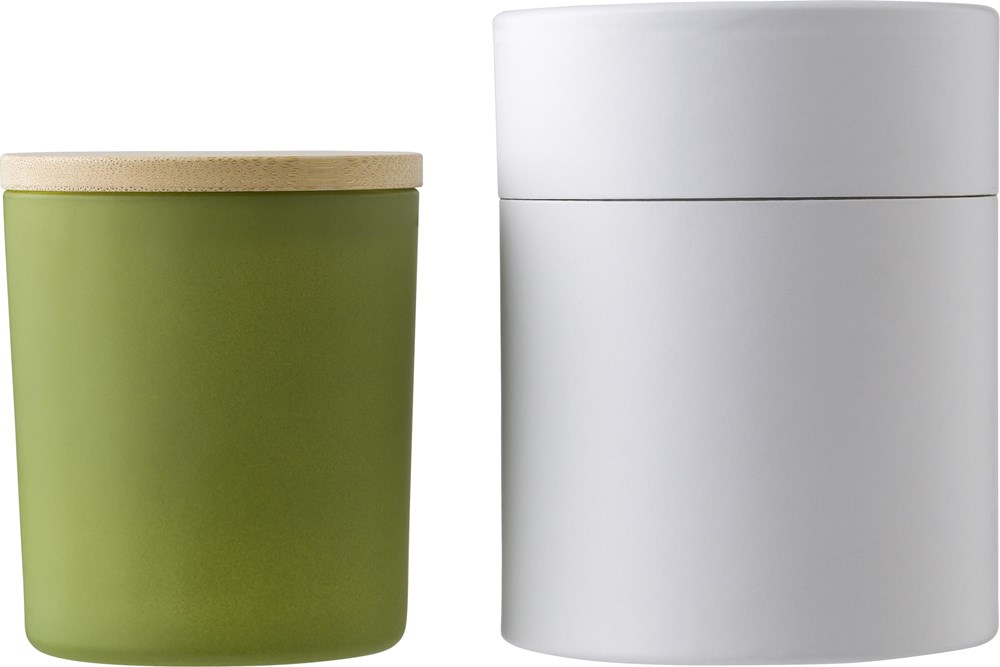 Glaskerze mit pflanzlichem Wachs und einem Deckel aus Bambus. Die Kerze enthält hauptsächlich Wachs auf pflanzlicher Basis (Carnaubawachs) und hat eine Brenndauer von ca. 46 Stunden. Vier Düfte je nach Glasfarbe: Zimt (rot), Vanille (weiß), Sandelholz (schwarz) und Jasmin (grün). Einzeln verpackt in einer weißen Verpackung. Größe Kerze: Durchmesser 9cm / Höhe 10,5cm