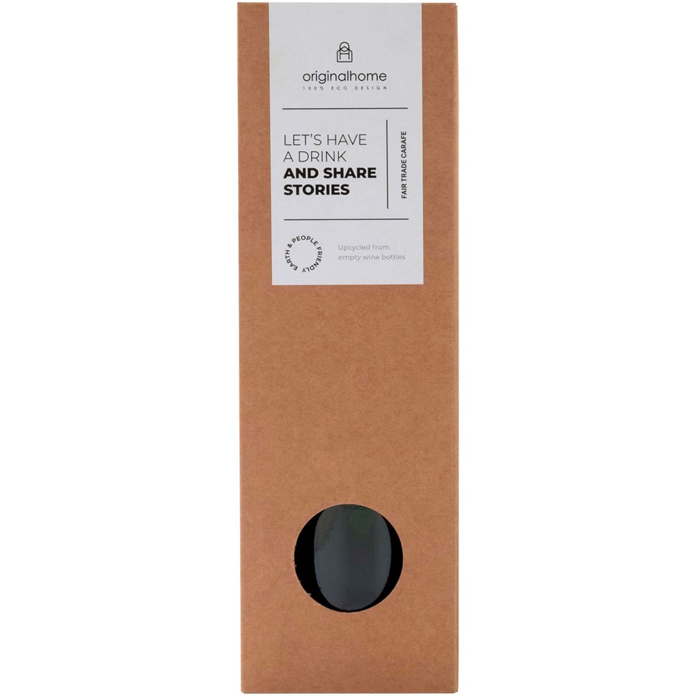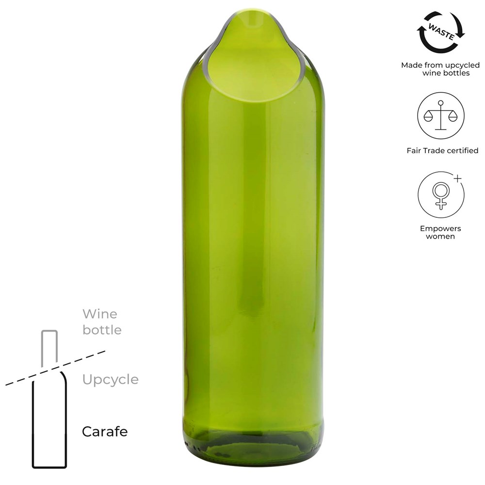 Handgefertigte 750 ml Wasserkaraffe aus upcycelten Weinflaschen aus Sansibar, Tansania. Die Weinflaschen werden von Hotels, Restaurants und Bars eingesammelt und dann sortiert, gereinigt und in verschiedene Formen und Größen geschnitten. In einem Geschenkkarton geliefert.