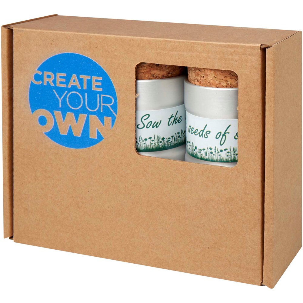 Dieses Schreibtisch-Garten-Set enthält drei Töpfe aus gebürstetem, recyceltem Aluminium. Es enthält eine innovative Samenkugel mit einer bienenfreundlichen Blumenmischung ( Kleeblatt, Fingerhut, Rotklee, Kreuzkraut und wilder Majoran), die in 1 bis 2 Wochen keimt. Jede Packung umfasst einen Topf, einen Korkstopfen, eine Anbauanleitung und organische Erdtabletten. Wenn Ihre Pflanzen groß geworden sind, können Sie den Topf zum Weiterkultivieren, Lagern oder Recyceln wiederverwenden. Geliefert in einer Geschenkbox, die auch bedruckt werden kann. Hergestellt in Europa.