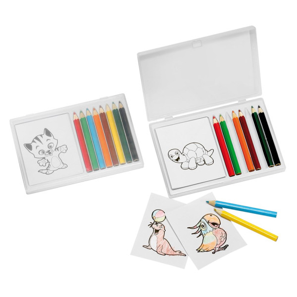 8 Buntstifte und 12 Malvorlagen in Box mit transparentem Deckel