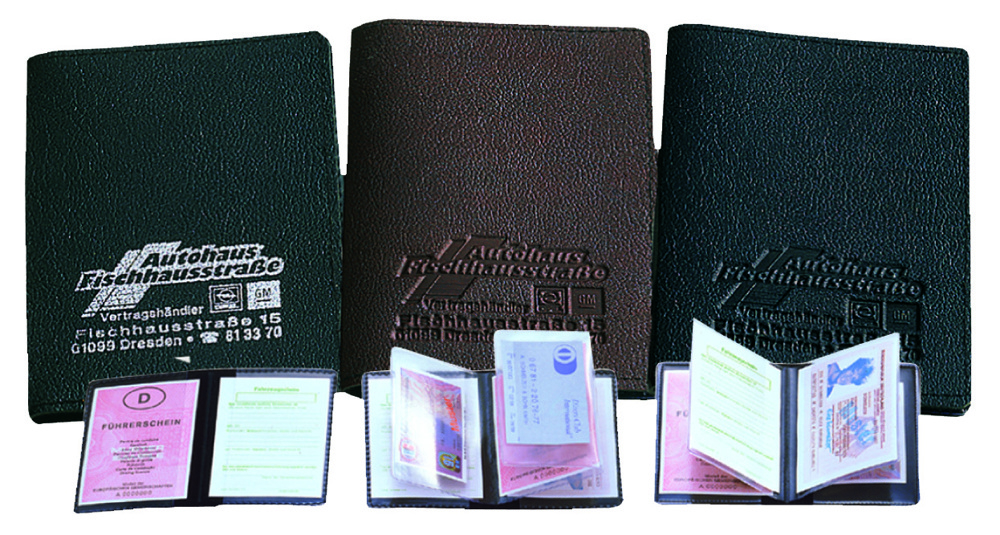 Solide Führerscheintasche aus wertigem Kunstleder mit 5 Klarsichtfächern, offenkantig.