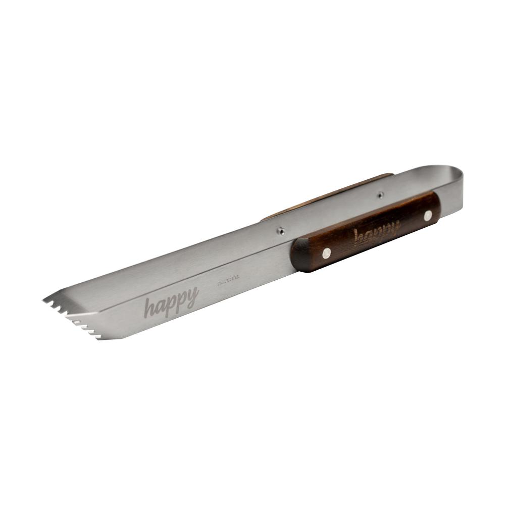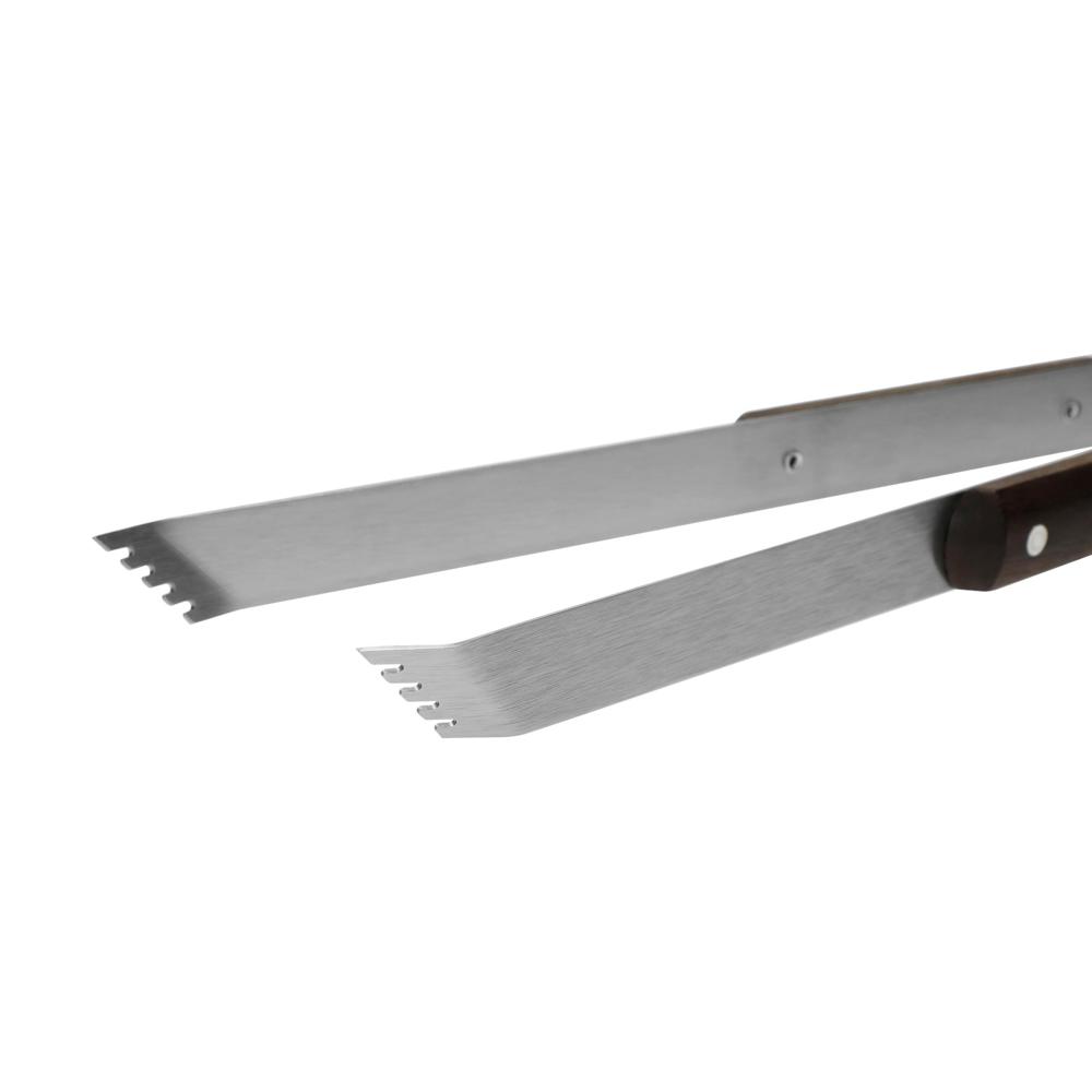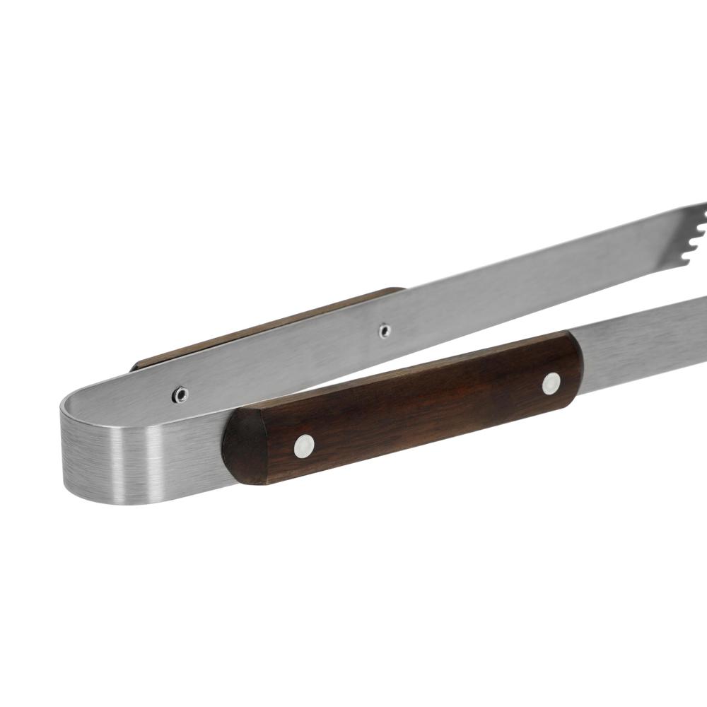 Praktische und flexible Grillzange aus Edelstahl mit Holzgriffen aus Birkenholz.