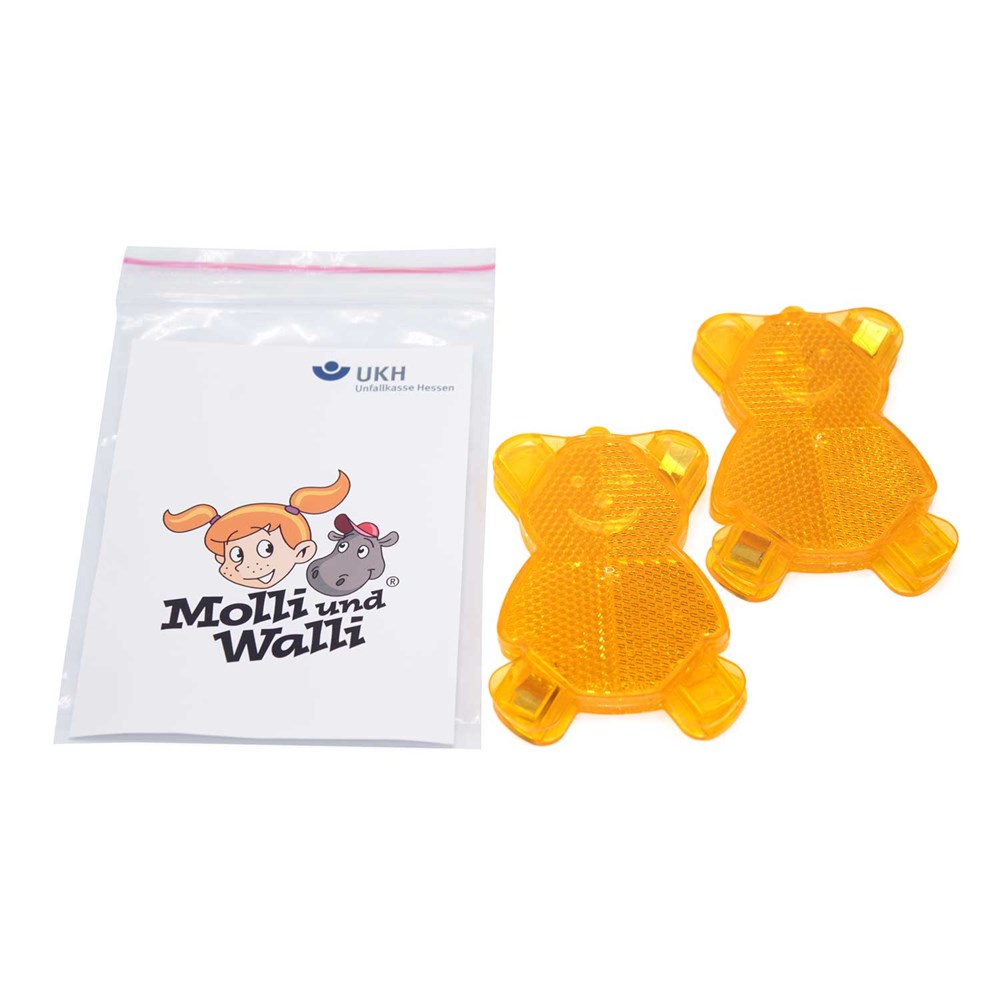 Sie können unsere Speichenstrahler auch im Set bekommen. Der Speichenstrahler ist durch die Federklammern für alle Speichenarten einsetzbar. Produziert nach dem deutschen Prüfzeichen der StVZO (Straßen-Verkehrs-Zulassungs-Ordnung). Set besteht aus 2 Stück Speichenstrahlern Bär und wird im wiederverschließbaren Polybeutel mit 4c bedrucktem Papiereinleger verpackt. ProdSG wird in das Druckbild integriert.