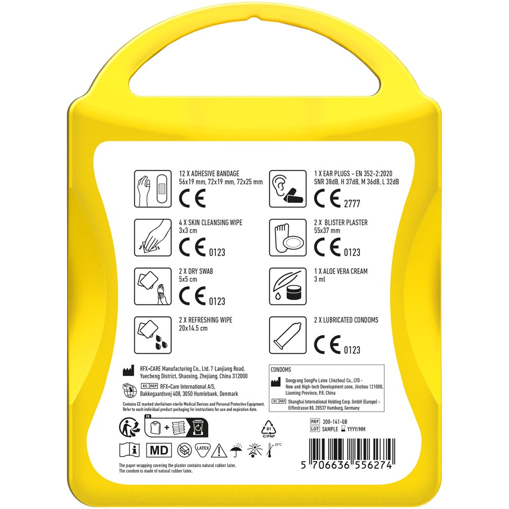 Ideales Erste-Hilfe Set für jedes Festival. Mit diesem Set sind Sie auf alles gut vorbereitet während eines Festivals. Inhalt: 12 wasserfeste Pflaster, 4 hautreinigende Tupfer, 2 Trockentupfer, 2 Reinigungstücher, 2 Kondome, 2 Blasenpflaster, 1 Aloe Vera Creme, 2 Ohrstöpsel. Alle im Set enthaltenen Erste-Hilfe- und Pflegeprodukte erfüllen alle geltenden EU-Vorschriften. Preis inkl. vollfarbigem Druck.