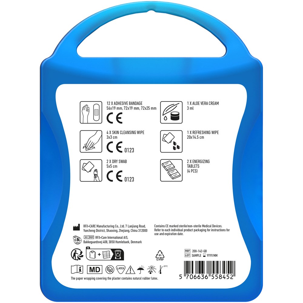 Ideales Set für neue Energie. Mit diesem Set können Sie sich erfrischen sowie neue Energie zuführen und Sie sind gut vorbereitet bei kleinen Unfällen oder Verletzungen. Inhalt: 12 wasserfeste Pflaster, 2 Täfelchen Traubenzucker (4 Stück), 1 Reinigungstuch, 1 Aloe Vera Creme, 4 hautreinigende Tupfer, 2 Trockentupfer. Alle im Set enthaltenen Erste-Hilfe- und Pflegeprodukte erfüllen alle geltenden EU-Vorschriften. Preis inkl. vollfarbigem Druck.