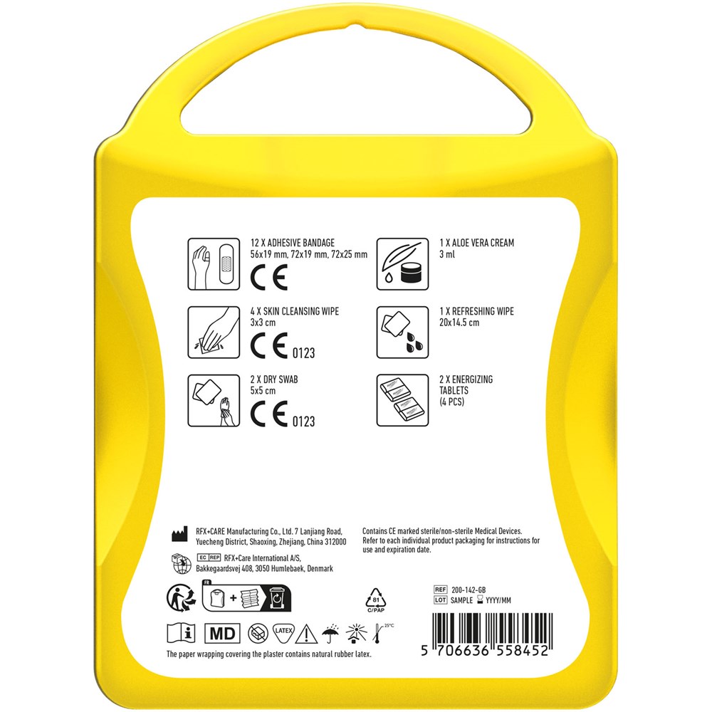 Ideales Set für neue Energie. Mit diesem Set können Sie sich erfrischen sowie neue Energie zuführen und Sie sind gut vorbereitet bei kleinen Unfällen oder Verletzungen. Inhalt: 12 wasserfeste Pflaster, 2 Täfelchen Traubenzucker (4 Stück), 1 Reinigungstuch, 1 Aloe Vera Creme, 4 hautreinigende Tupfer, 2 Trockentupfer. Alle im Set enthaltenen Erste-Hilfe- und Pflegeprodukte erfüllen alle geltenden EU-Vorschriften. Preis inkl. vollfarbigem Druck.