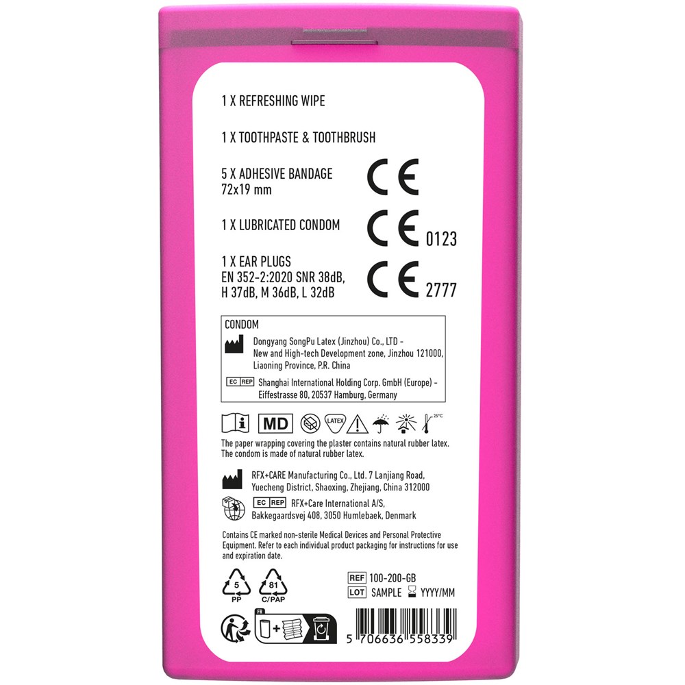 Ideales Reiseset für Festivals und es enthält alle Dinge für eine Übernachtung. Das Set kann leicht in der Tasche verstaut werden. Inhalt: 1 Zahnbürste, 1 Zahnpasta, 2 Ohrstöpsel, 1 Desinfektionsgel, 5 wasserfeste Pflaster, 1 Kondom. Alle im Set enthaltenen Erste-Hilfe- und Pflegeprodukte erfüllen alle geltenden EU-Vorschriften. Preis inkl. vollfarbigem Druck.