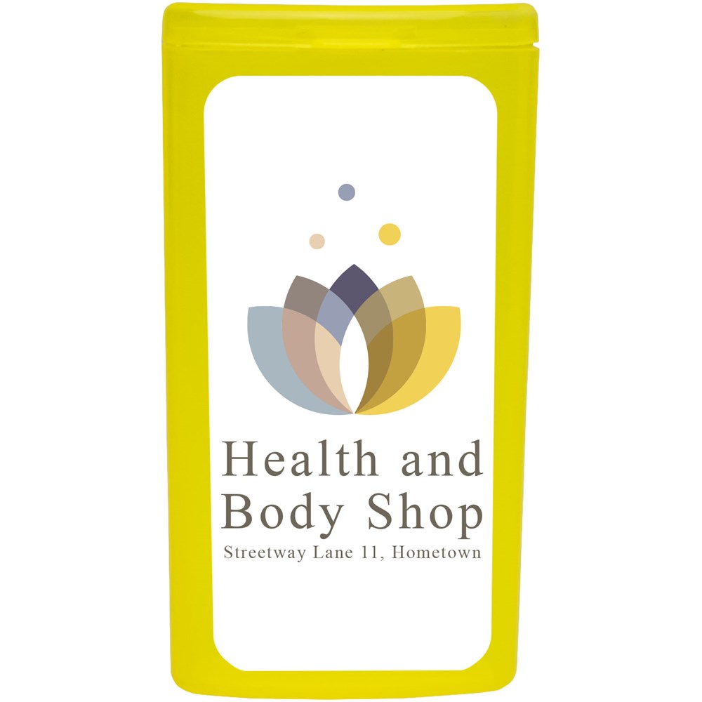 Ideales Reiseset für Festivals und es enthält alle Dinge für eine Übernachtung. Das Set kann leicht in der Tasche verstaut werden. Inhalt: 1 Zahnbürste, 1 Zahnpasta, 2 Ohrstöpsel, 1 Desinfektionsgel, 5 wasserfeste Pflaster, 1 Kondom. Alle im Set enthaltenen Erste-Hilfe- und Pflegeprodukte erfüllen alle geltenden EU-Vorschriften. Preis inkl. vollfarbigem Druck.