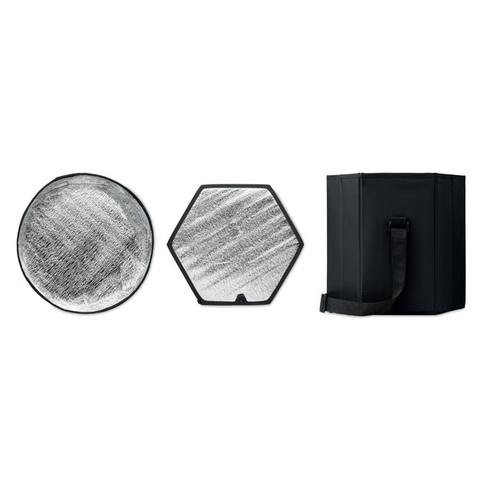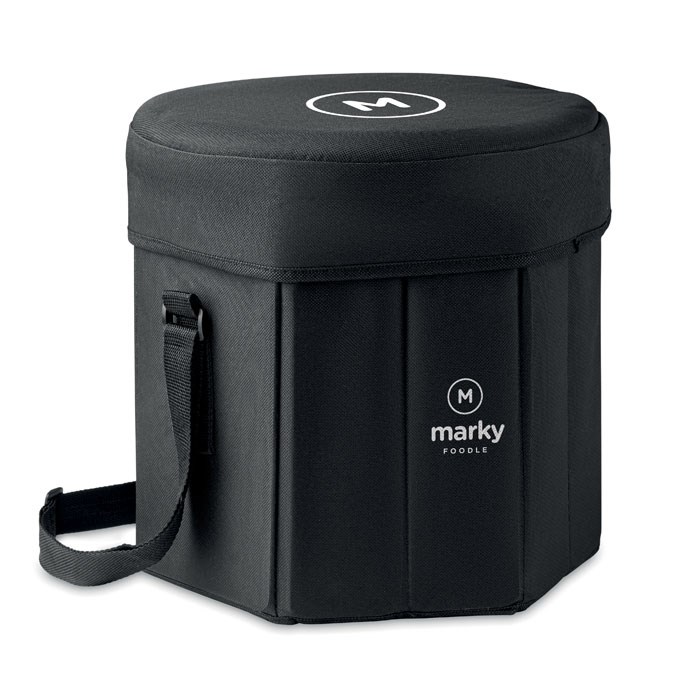 Klappbarer Hocker oder Tisch aus 600D-Polyester mit integrierter Kühltasche mit isolierender Aluminiumfolie. Inkl. Tragegurt. Max. Traglast 80 kg.