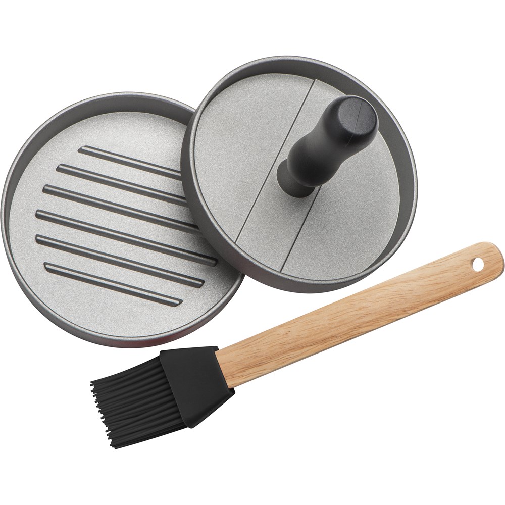 Burgerpresse in einer ansprechenden Verpackung bestehend aus einer Aluminium Pattypresse und einem Silikonpinsel. Durch einen Aufkleber (CMYK) auf dem Karton wird dieses Burgerset veredelt.