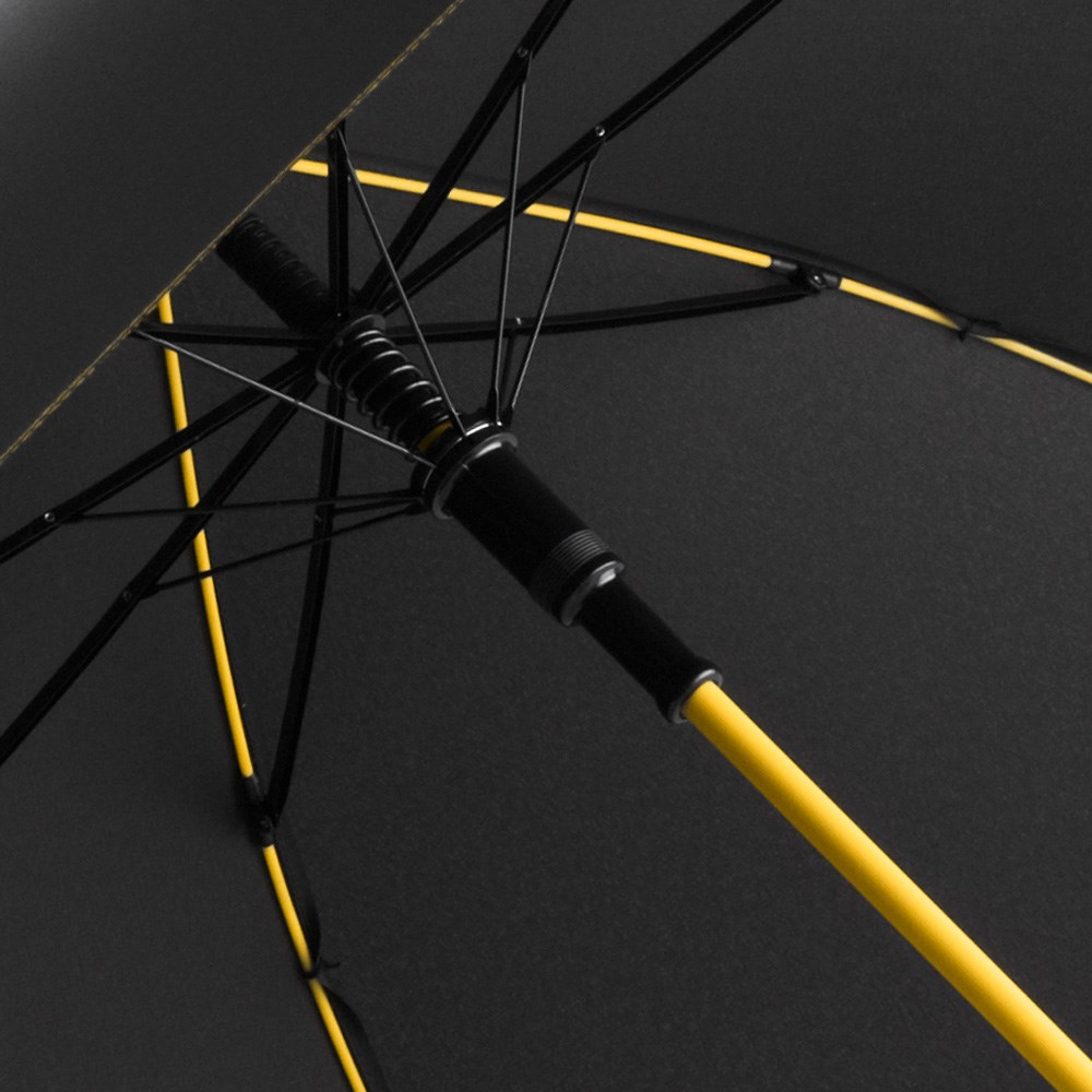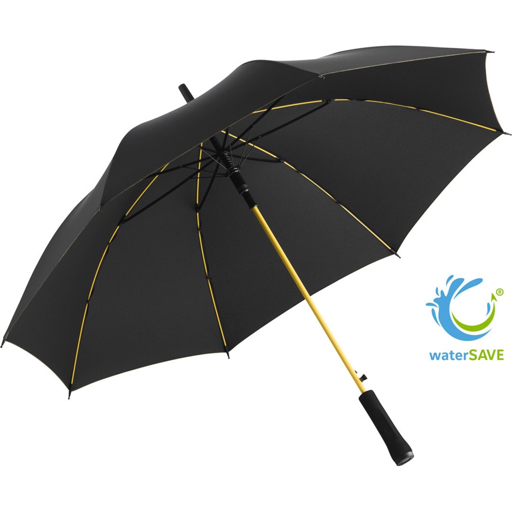 Schicker Automatik-Stockschirm mit farbigem Stock und farbigen Schienen Komfortable Automatik-Funktion zum schnellen Öffnen, Windproof-System für höhere Gestell-Flexibilität und bessere Windsicherheit, flexible Fiberglasschienen, stabiler Stahlstock mit farbiger Kunststoffummantelung, Polyester-Pongee Bezugsmaterial aus recycelten Kunststoffen, umweltfreundlich dank original waterSAVE® Bezugsmaterial, dezente Verzierung des Bezugs durch farbige Nähte, exklusiver Softgriff mit Werbeanbringungsmöglichkeit, Auslösetaste mit Werbeanbringungsmöglichkeit, mit waterSAVE® Label auf dem Schließband. Auch als Taschenschirm (Art. 5644) erhältlich.
