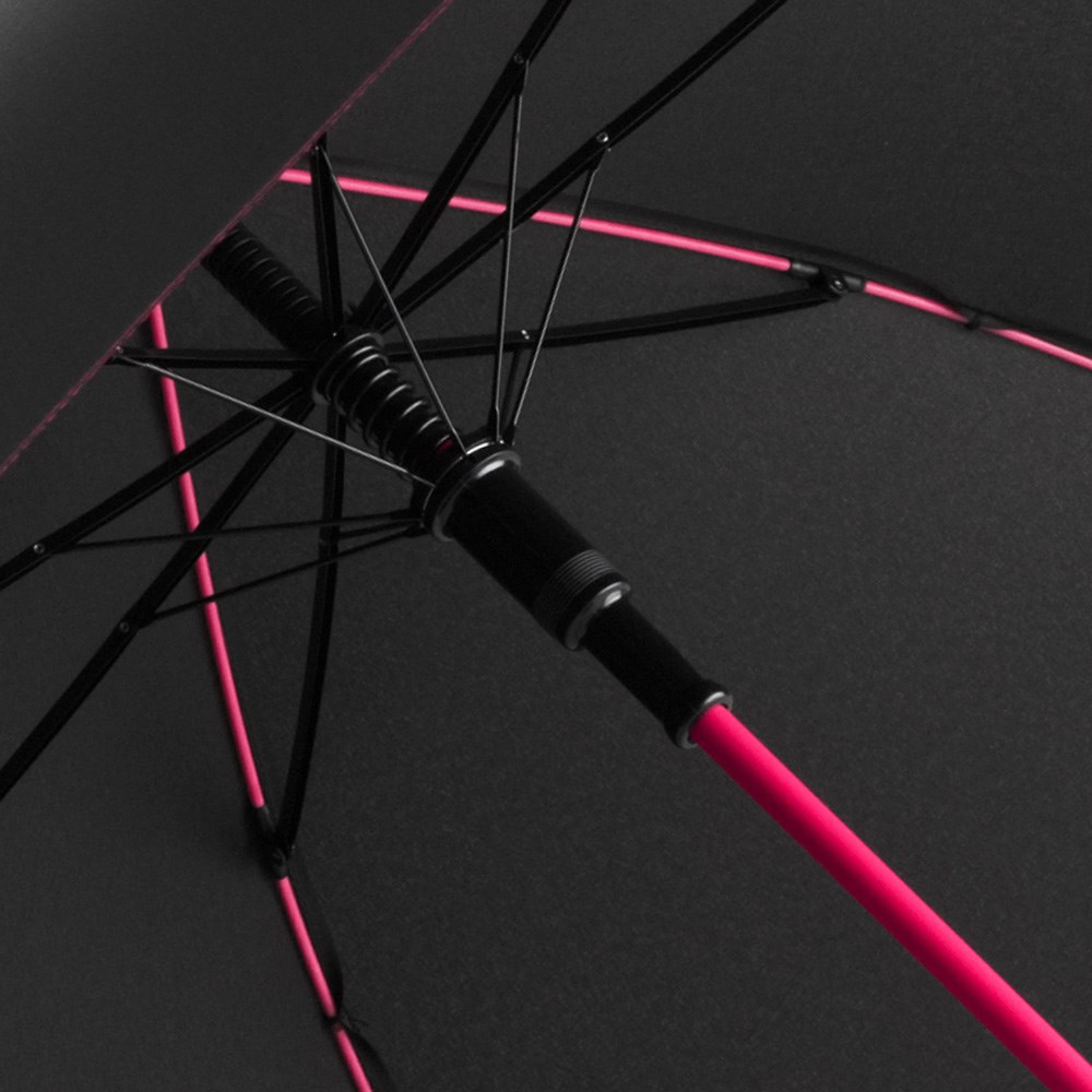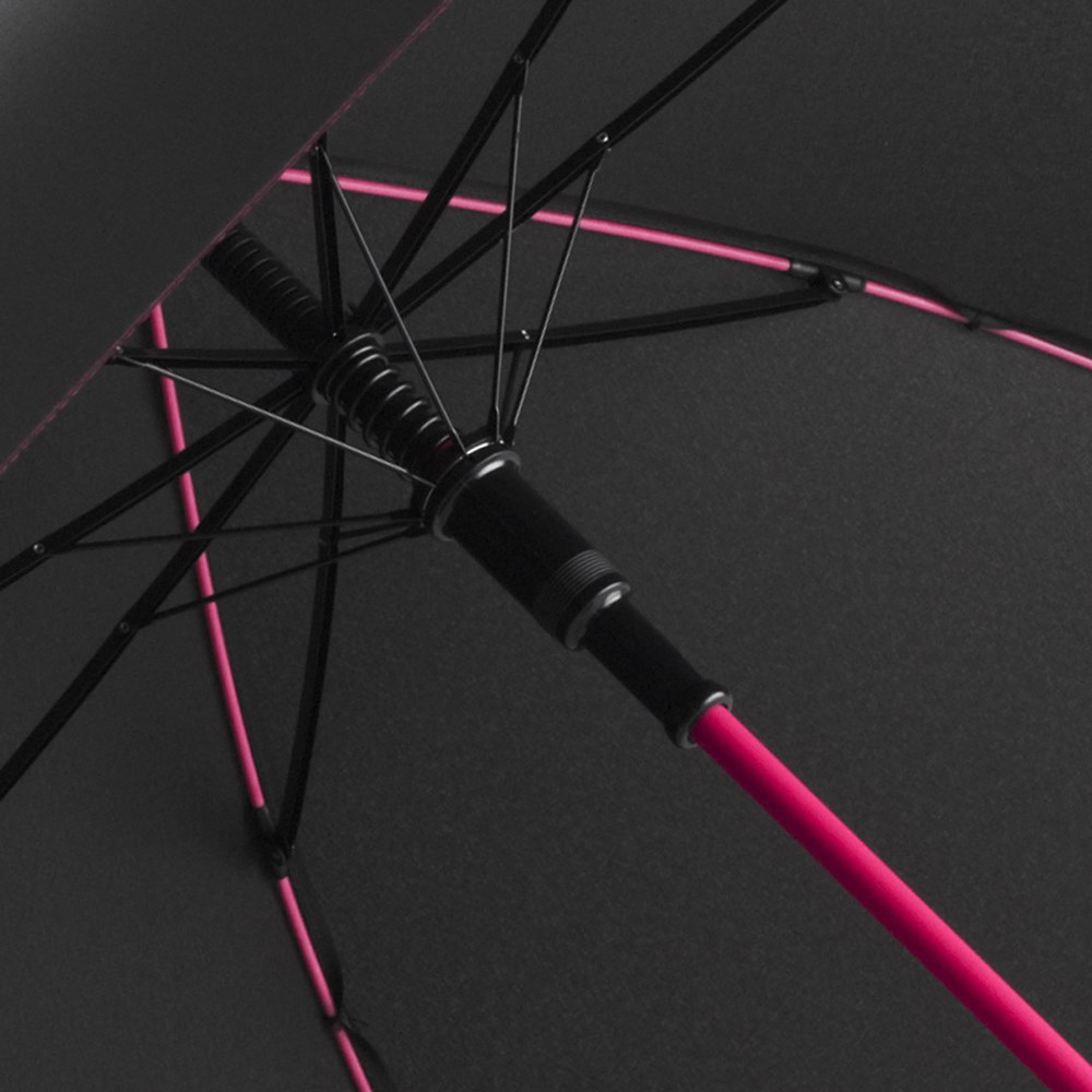 Schicker Automatik-Stockschirm mit farbigem Stock und farbigen Schienen Komfortable Automatik-Funktion zum schnellen Öffnen, Windproof-System für höhere Gestell-Flexibilität und bessere Windsicherheit, flexible Fiberglasschienen, stabiler Stahlstock mit farbiger Kunststoffummantelung, Polyester-Pongee Bezugsmaterial aus recycelten Kunststoffen, umweltfreundlich dank original waterSAVE® Bezugsmaterial, dezente Verzierung des Bezugs durch farbige Nähte, exklusiver Softgriff mit Werbeanbringungsmöglichkeit, Auslösetaste mit Werbeanbringungsmöglichkeit, mit waterSAVE® Label auf dem Schließband. Auch als Taschenschirm (Art. 5644) erhältlich.
