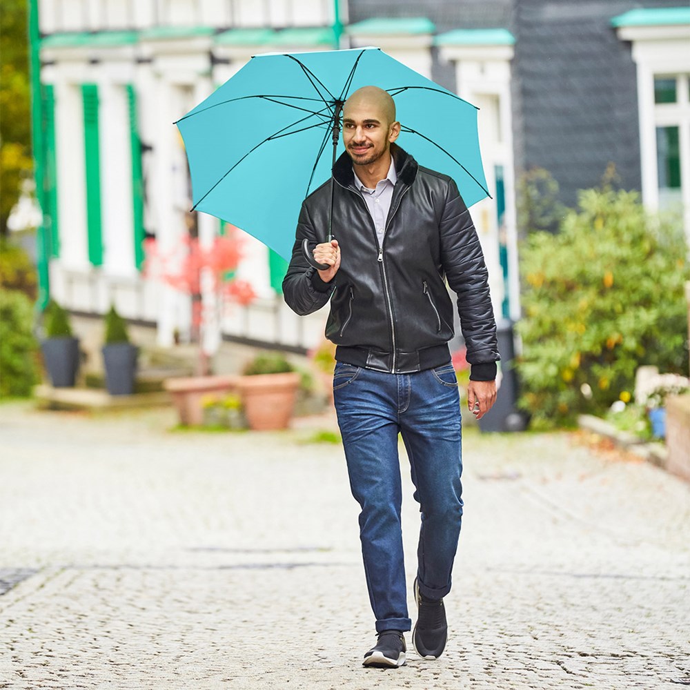 Preislich attraktiver Automatik-Stockschirm mit Windproof-System Komfortable Automatik-Funktion zum schnellen Öffnen, Windproof-System für höhere Gestell-Flexibilität und bessere Windsicherheit, flexible Fiberglasschienen, matt-schwarzer Kunststoff Rundhakengriff, höherer Korrosionsschutz durch schwarze Galvanisierung des Stahlstocks. Auch als Gästeschirm (Art. 2359) erhältlich.