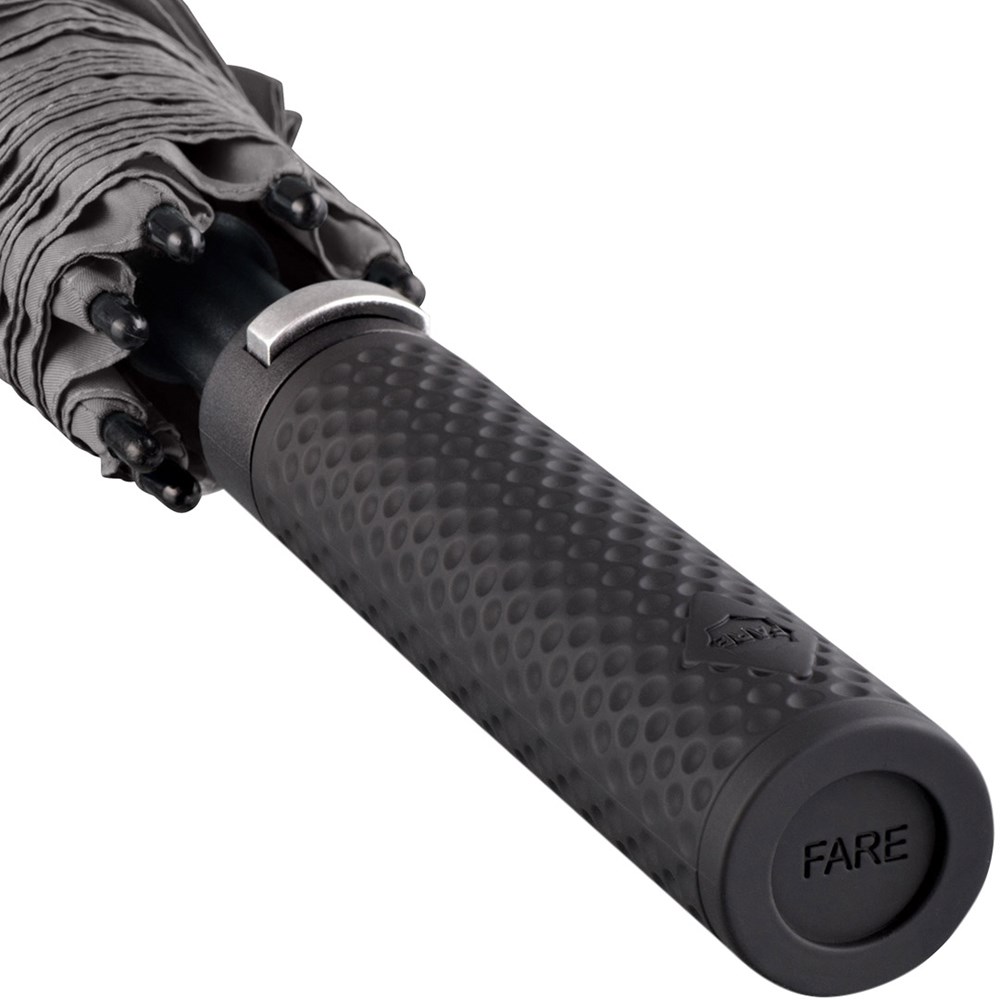 Exklusiver Automatik-Golf-/Gästeschirm für zwei Personen mit Golf-Design-Griff Komfortable Automatik-Funktion zum schnellen Öffnen, hochwertiges Windproof-PLUS-System für eine maximale Gestell-Flexibilität bei stärkeren Windböen, stabiler Fiberglasstock, flexible Fiberglasschienen, überlappender Ventilationsbezug zur Regulierung von Überdruck durch stärkere Windböen, Bezug mit zwei Schließbändern zur optimalen Fixierung im geschlossenen Zustand, exklusiver Soft-Touch-Griff in Golfball-Haptik mit silberner Auslösetaste und Werbeanbringungsmöglichkeit, komfortables Tragefutteral, gastfreundlicher großer Durchmesser