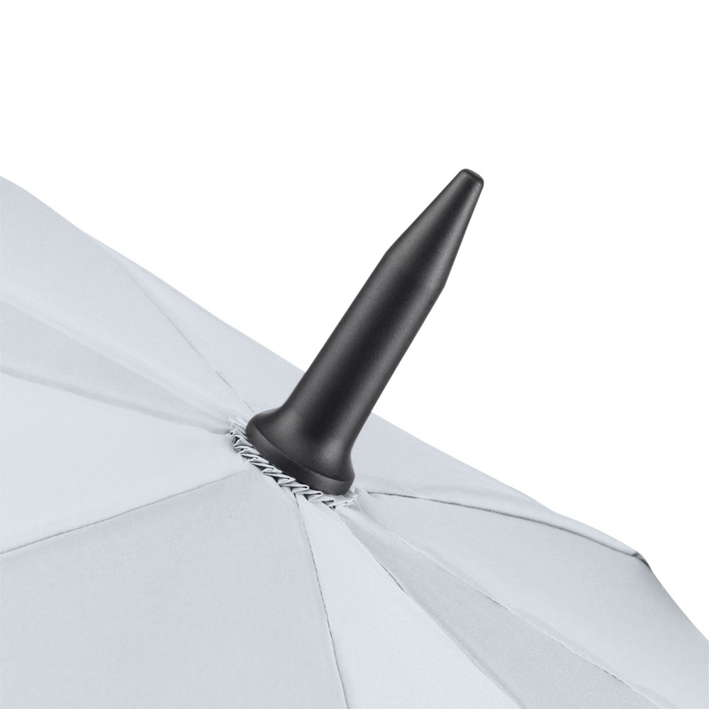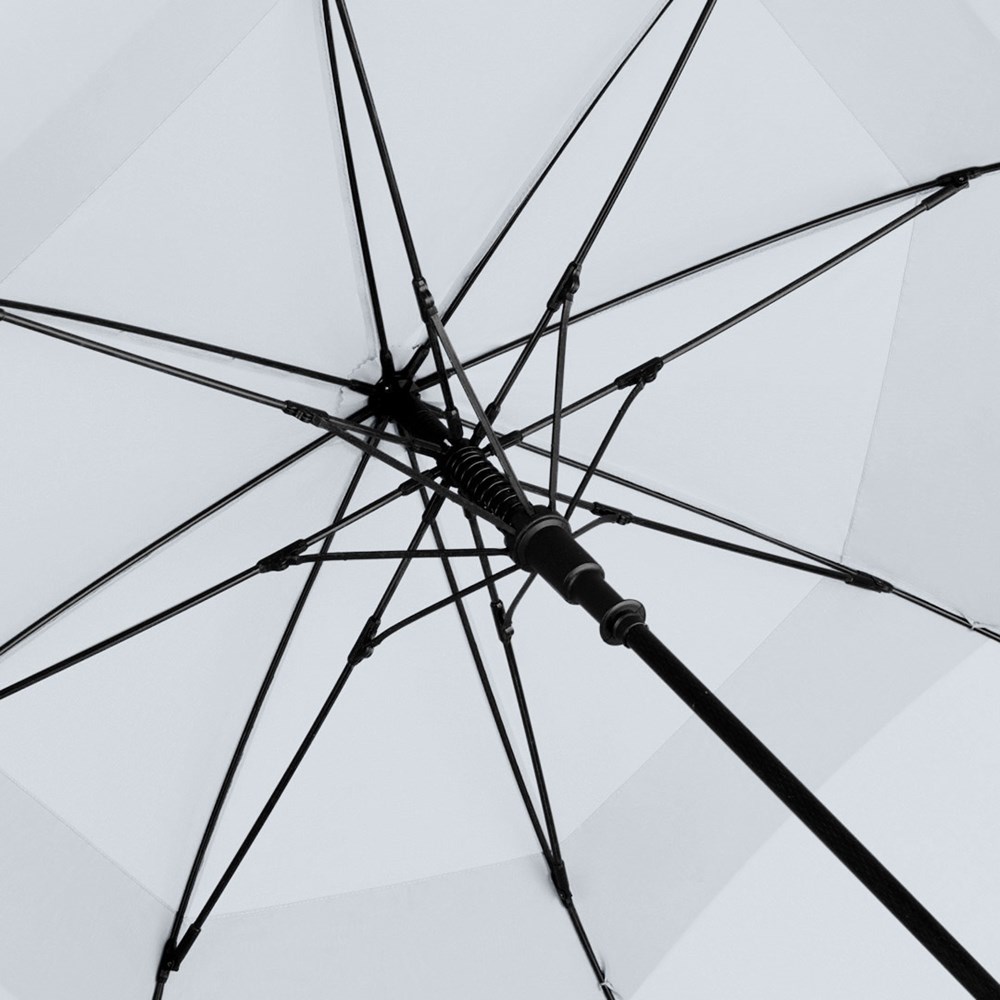 Exklusiver Automatik-Golf-/Gästeschirm für zwei Personen mit Golf-Design-Griff Komfortable Automatik-Funktion zum schnellen Öffnen, hochwertiges Windproof-PLUS-System für eine maximale Gestell-Flexibilität bei stärkeren Windböen, stabiler Fiberglasstock, flexible Fiberglasschienen, überlappender Ventilationsbezug zur Regulierung von Überdruck durch stärkere Windböen, Bezug mit zwei Schließbändern zur optimalen Fixierung im geschlossenen Zustand, exklusiver Soft-Touch-Griff in Golfball-Haptik mit silberner Auslösetaste und Werbeanbringungsmöglichkeit, komfortables Tragefutteral, gastfreundlicher großer Durchmesser