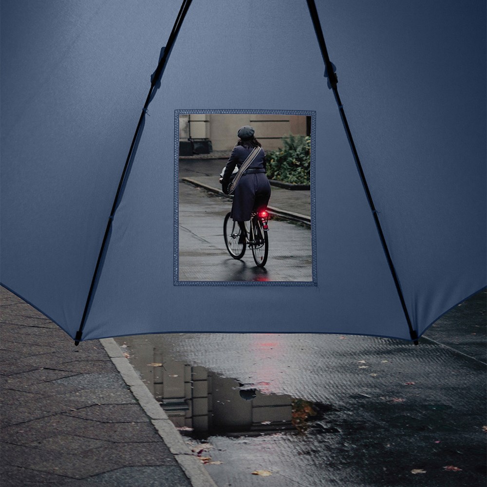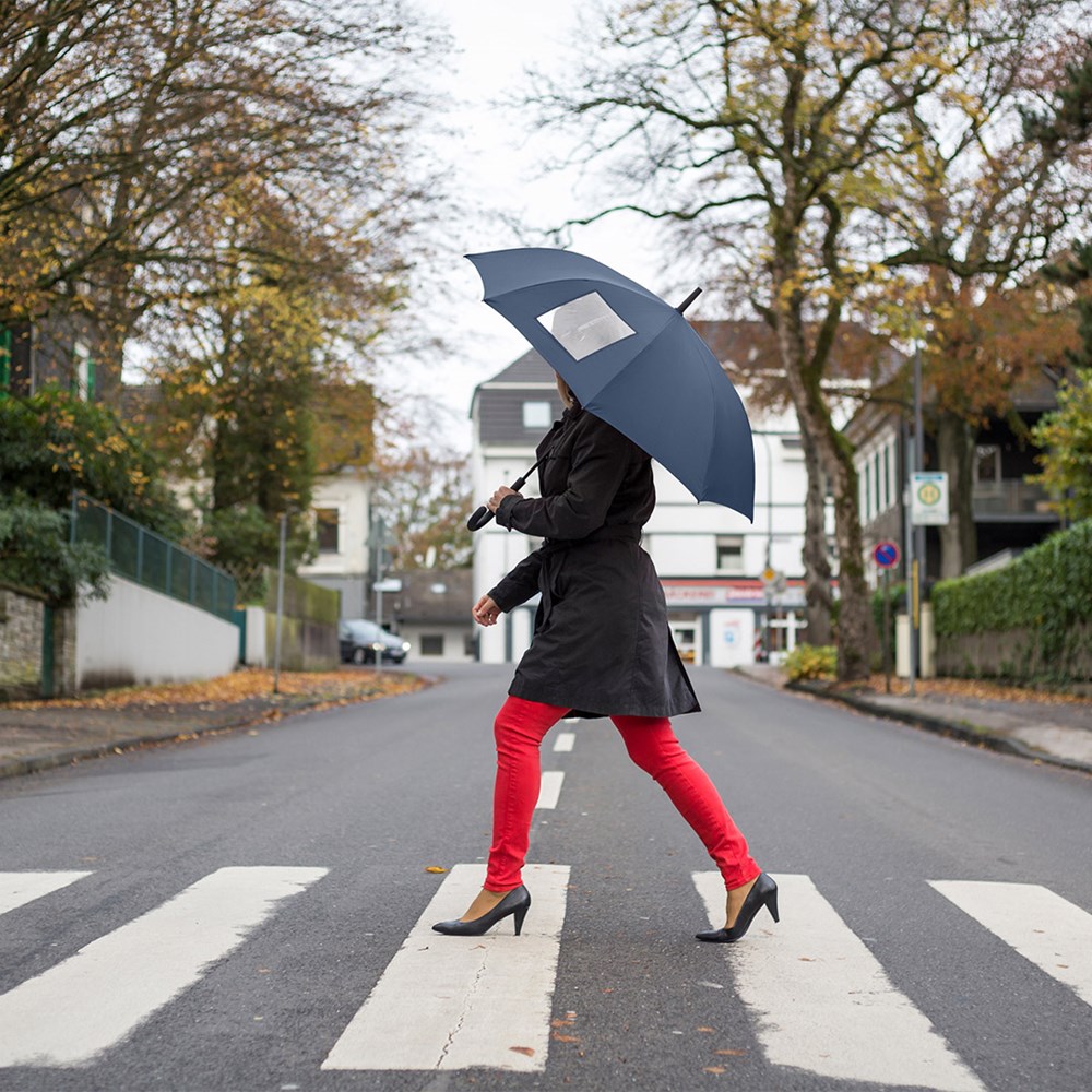 Besonderer Automatik-Stockschirm mit transparentem Sichtfenster Komfortable Automatik-Funktion zum schnellen Öffnen, hochwertiges Windproof-PLUS-System für eine maximale Gestell-Flexibilität bei stärkeren Windböen, flexible Fiberglasschienen, stabiler Stahlstock, Soft-Touch-Griff und -Top, Griff mit integrierter Auslösetaste und Werbeanbringungsmöglichkeit, höherer Korrosionsschutz durch schwarze Galvanisierung des Stahlstocks, transparentes Sichtfenster in einem Segment