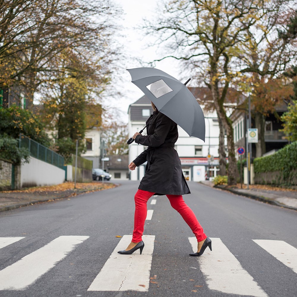 Besonderer Automatik-Stockschirm mit transparentem Sichtfenster Komfortable Automatik-Funktion zum schnellen Öffnen, hochwertiges Windproof-PLUS-System für eine maximale Gestell-Flexibilität bei stärkeren Windböen, flexible Fiberglasschienen, stabiler Stahlstock, Soft-Touch-Griff und -Top, Griff mit integrierter Auslösetaste und Werbeanbringungsmöglichkeit, höherer Korrosionsschutz durch schwarze Galvanisierung des Stahlstocks, transparentes Sichtfenster in einem Segment