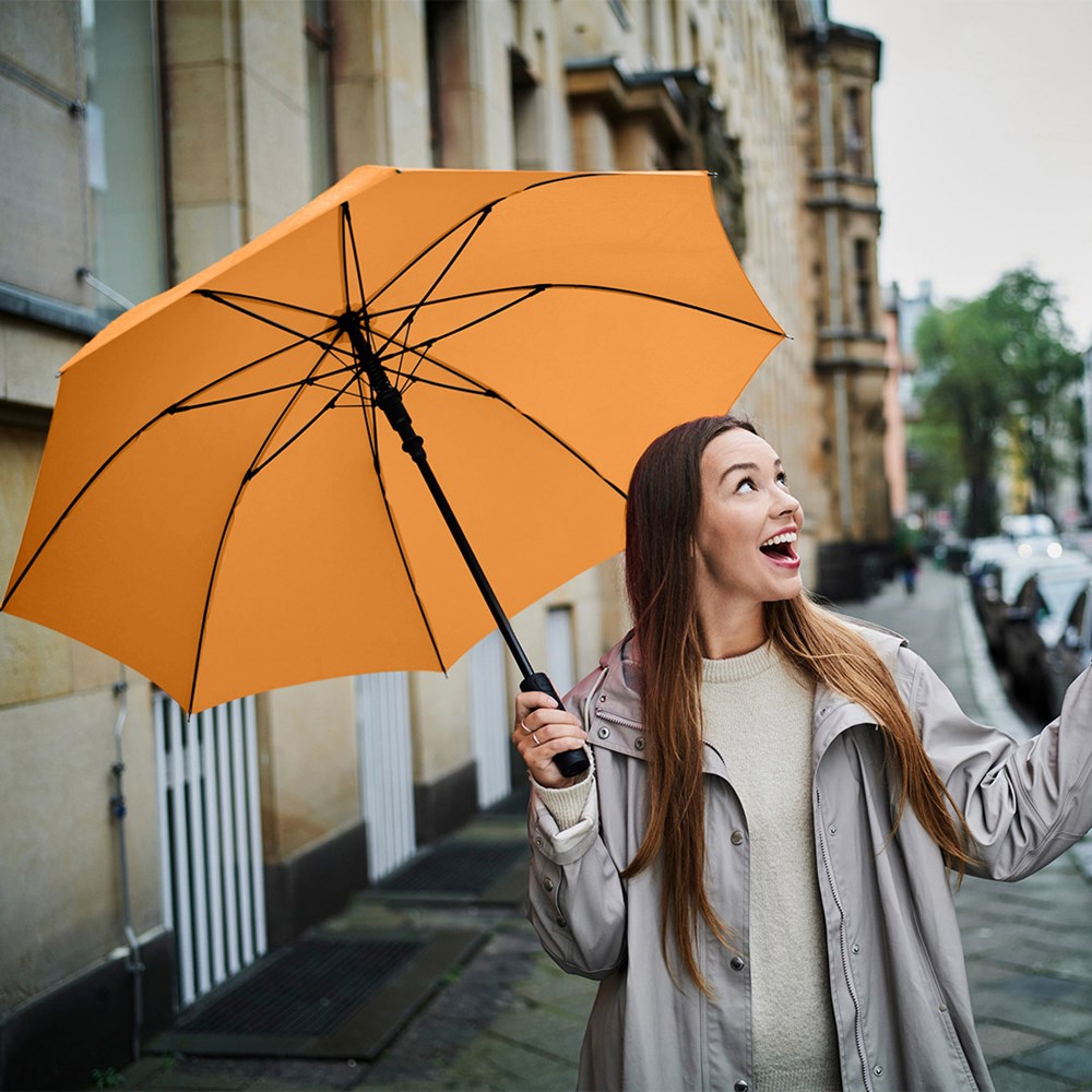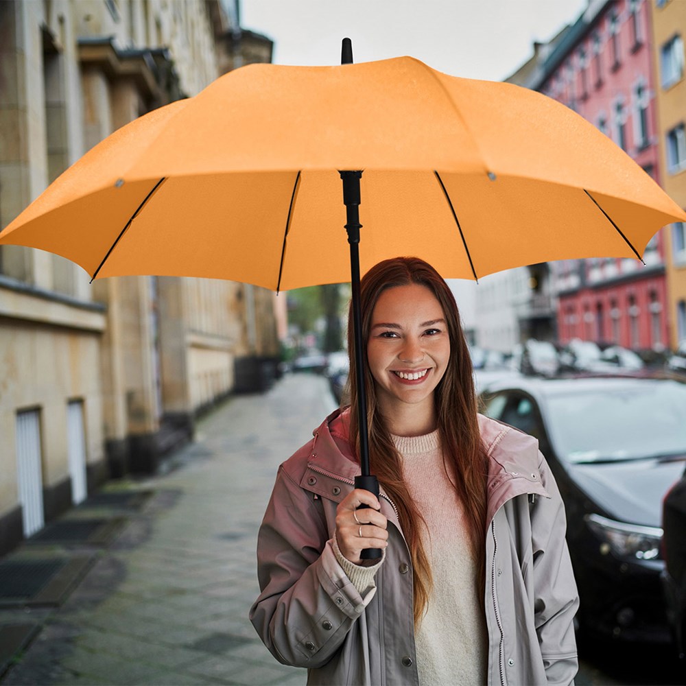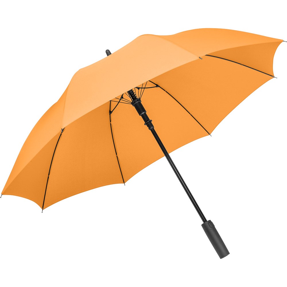 Preislich attraktiver Automatik-Stockschirm mit Windproof-PLUS-System Komfortable Automatik-Funktion zum schnellen Öffnen, hochwertiges Windproof-PLUS-System für eine maximale Gestell-Flexibilität bei stärkeren Windböen, flexible Fiberglasschienen, höherer Korrosionsschutz durch schwarze Galvanisierung des Stahlstocks, handsympathischer Soft-Feel-Griff mit integrierter Auslösetaste und Werbeanbringungsmöglichkeit.