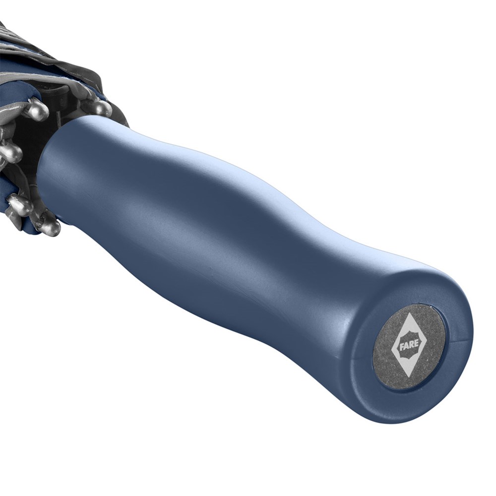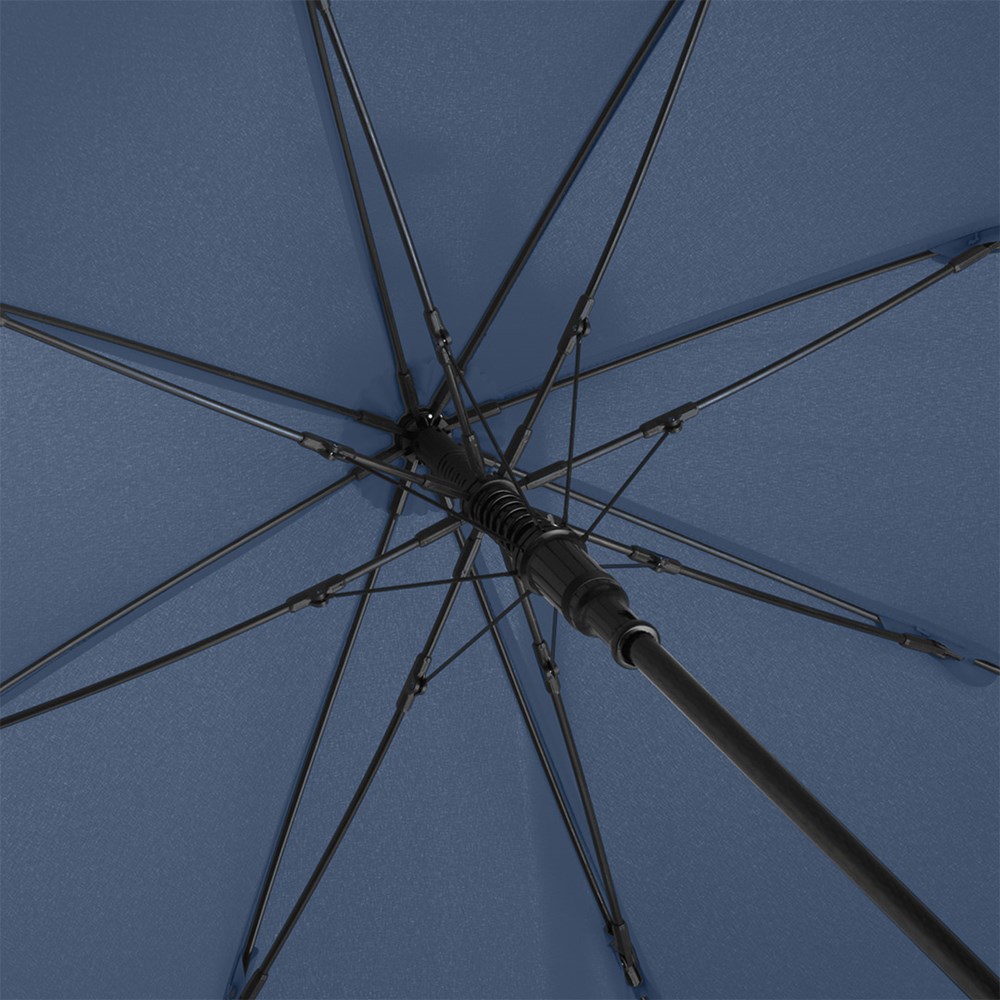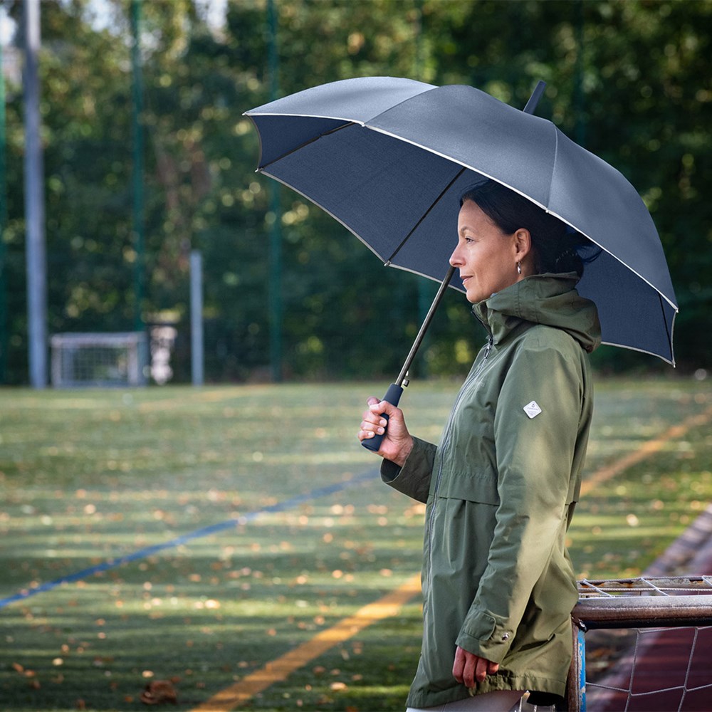 Markanter Automatik-Stockschirm mit modisch reflektierender Paspelierung Komfortable Automatik-Funktion zum schnellen Öffnen, hochwertiges Windproof-PLUS-System für eine maximale Gestell-Flexibilität bei stärkeren Windböen, stabiler Fiberglasstock, flexible Fiberglasschienen, Bezug mit modischer Reflexpaspel in Silber, handsympatischer Soft-Touch-Griff mit Werbeanbringungsmöglichkeit, Soft-Touch-Top