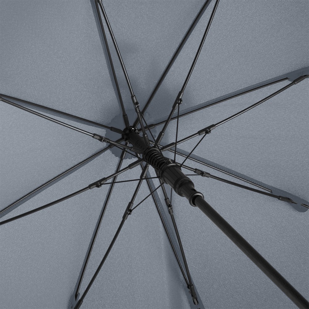 Markanter Automatik-Stockschirm mit modisch reflektierender Paspelierung Komfortable Automatik-Funktion zum schnellen Öffnen, hochwertiges Windproof-PLUS-System für eine maximale Gestell-Flexibilität bei stärkeren Windböen, stabiler Fiberglasstock, flexible Fiberglasschienen, Bezug mit modischer Reflexpaspel in Silber, handsympatischer Soft-Touch-Griff mit Werbeanbringungsmöglichkeit, Soft-Touch-Top