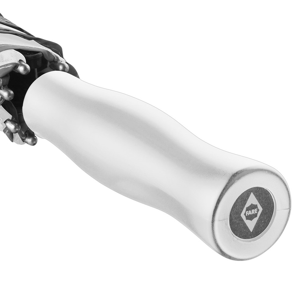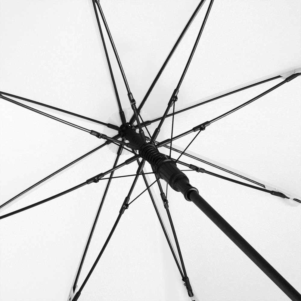 Markanter Automatik-Stockschirm mit modisch reflektierender Paspelierung Komfortable Automatik-Funktion zum schnellen Öffnen, hochwertiges Windproof-PLUS-System für eine maximale Gestell-Flexibilität bei stärkeren Windböen, stabiler Fiberglasstock, flexible Fiberglasschienen, Bezug mit modischer Reflexpaspel in Silber, handsympatischer Soft-Touch-Griff mit Werbeanbringungsmöglichkeit, Soft-Touch-Top
