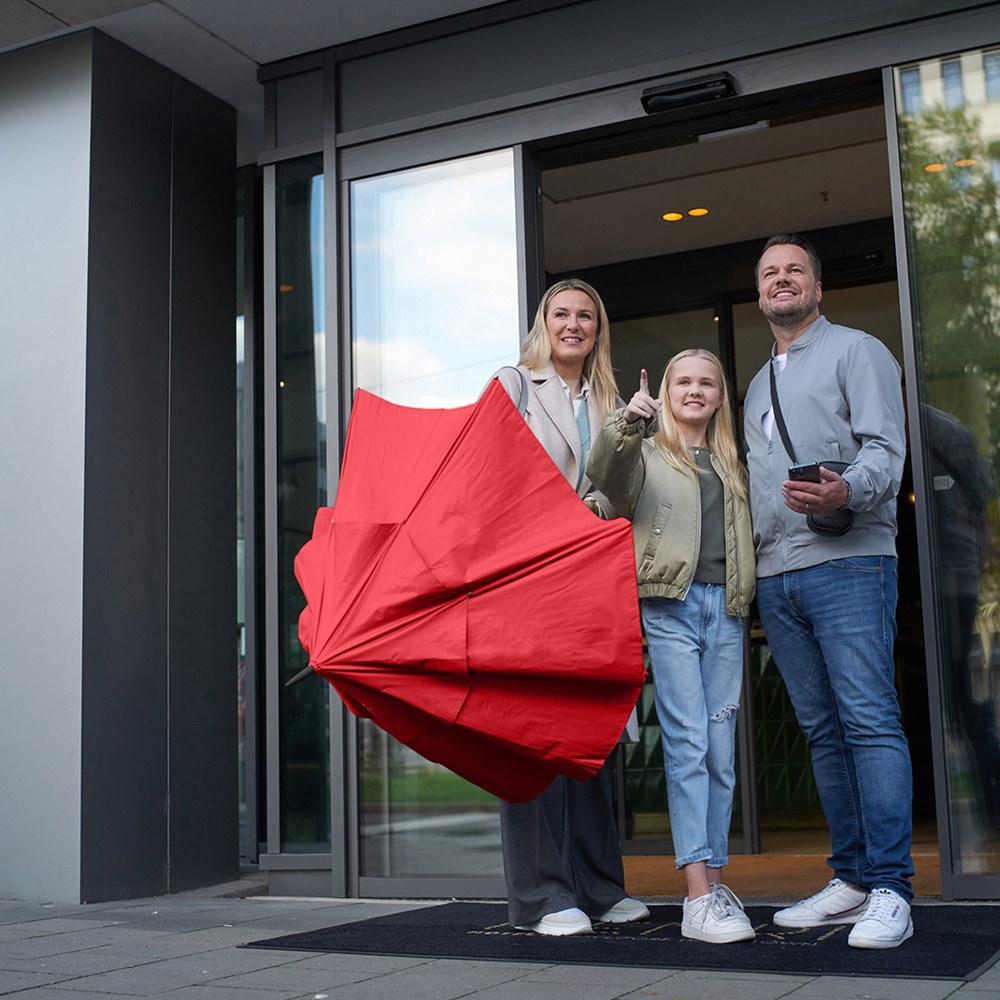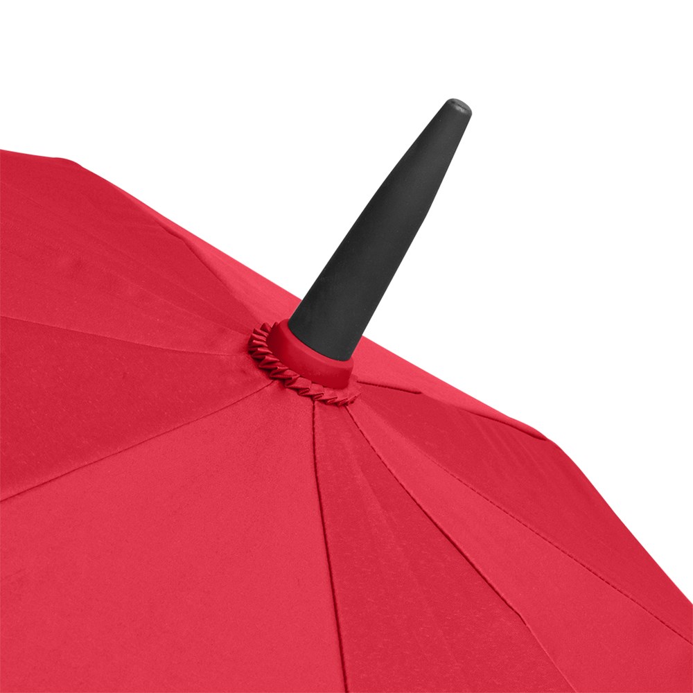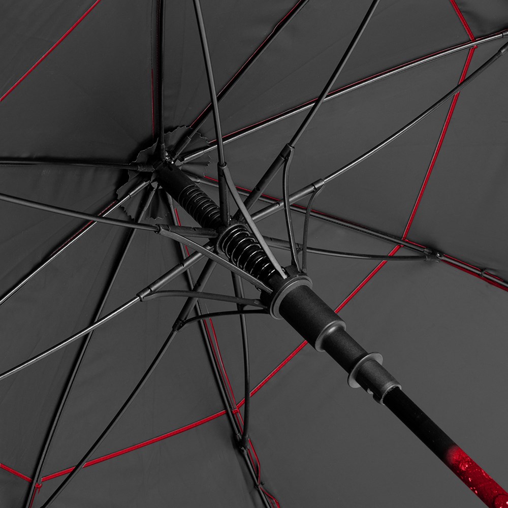 Exklusiver Automatik-Gästeschirm für zwei Personen mit Tropfenmotiv auf dem Fiberglasstock Komfortable Automatik-Funktion zum schnellen Öffnen, hochwertiges Windproof-PLUS-System für eine maximale Gestell-Flexibilität bei stärkeren Windböen, flexible Fiberglasschienen, stabiler Fiberglasstock mit Tropfenmotiv, wassersparend gefärbtes Polyester-Pongee waterSAVE® Bezugsmaterial aus recycelten Kunststoffen, mit waterSAVE® Label auf dem Schließband (bei neuen Chargen), von innen beschichteter Bezug, überlappender Ventilationsbezug zur Regulierung von Überdruck durch stärkere Windböen, gerader Softgriff mit farbigen Griffringen, integrierter Auslösetaste und Werbeanbringungsmöglichkeit, Tropfenmotiv und Griffringe farblich auf den Bezug abgestimmt