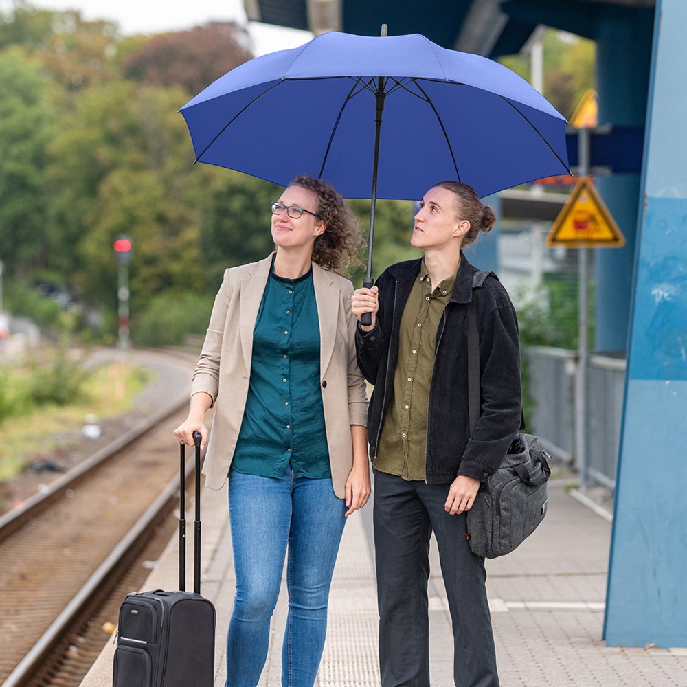 Äußerst stabiler Automatik-Gästeschirm für zwei Personen mit riesigem Durchmesser Komfortable Automatik-Funktion zum schnellen Öffnen, hochwertiges Windproof-PLUS-System für eine maximale Gestell-Flexibilität bei stärkeren Windböen, stabiler Fiberglasstock, flexible Fiberglasschienen, gerader Softgriff mit schmaler Auslösetaste, gastfreundlicher Durchmesser