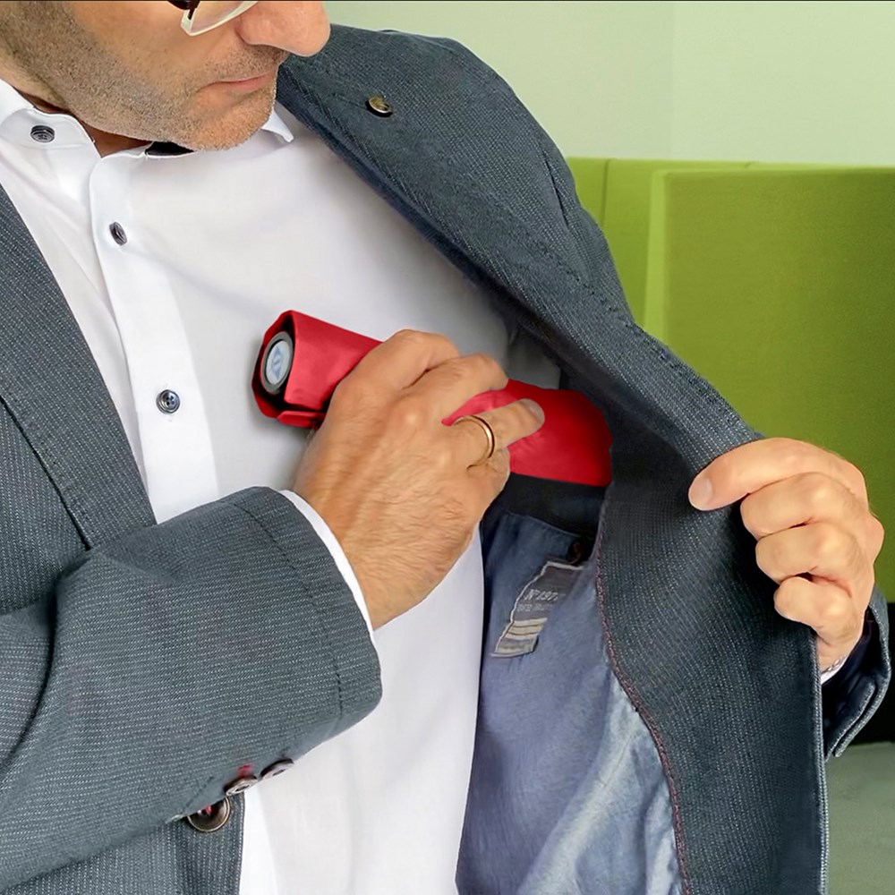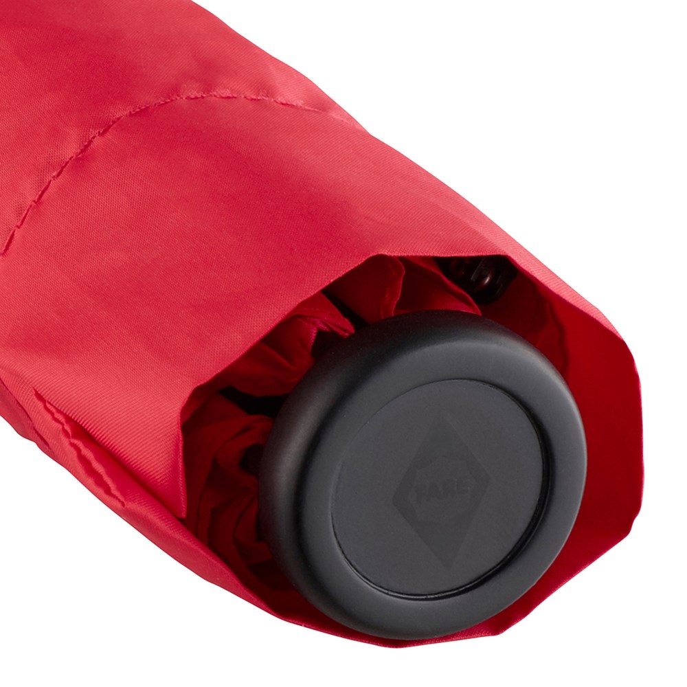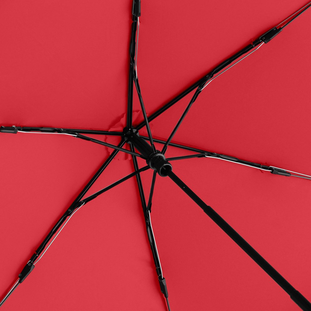 Filigraner Handöffner-Taschenschirm in ultraleichter Ausführung Einfache Handhabung durch Sicherheitsschieber, hochwertiges Windproof-PLUS-System für eine maximale Gestell-Flexibilität bei stärkeren Windböen, schwarzer Aluminiumstock, Polyester-Pongee Bezugsmaterial aus recycelten Kunststoffen, extra leichter Bezug, matt-schwarzer Kunststoffgriff aus recyceltem ABS (rABS) mit Werbeanbringungsmöglichkeit, handtaschentauglich durch ultraleichtes Gewicht und kompakte Größe