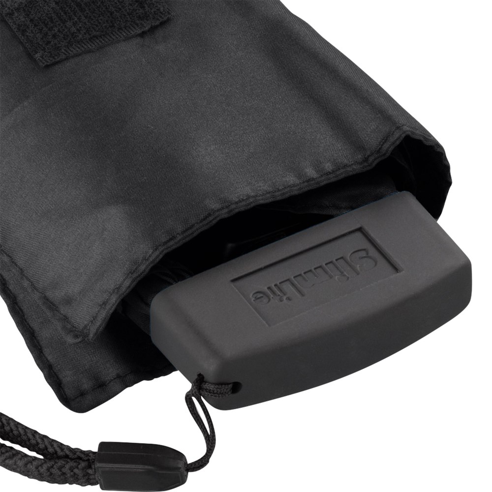 Ultraleichter Handöffner-Taschenschirm im praktischen Tragefutteral mit Karabinerhaken Hochwertiges Windproof-PLUS-System für eine maximale Gestell-Flexibilität bei stärkeren Windböen, verchromter Stahlstock, extra leichter Bezug, flacher Soft-Touch-Griff mit Werbeanbringungsmöglichkeit, Tragefutteral mit praktischem Karabinerhaken zur Befestigung an Rucksack oder Tasche, handtaschentauglich durch extrem leichtes Gewicht, platzsparend durch superflache Ausführung
