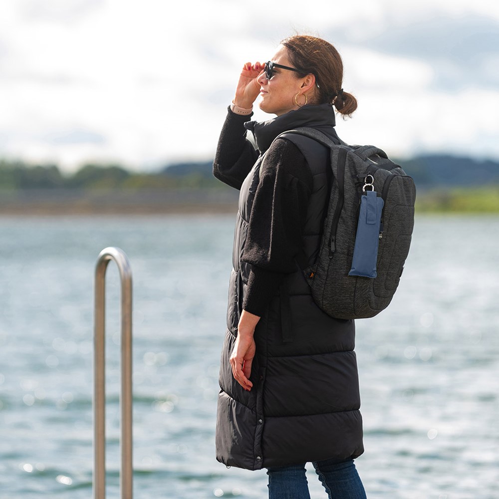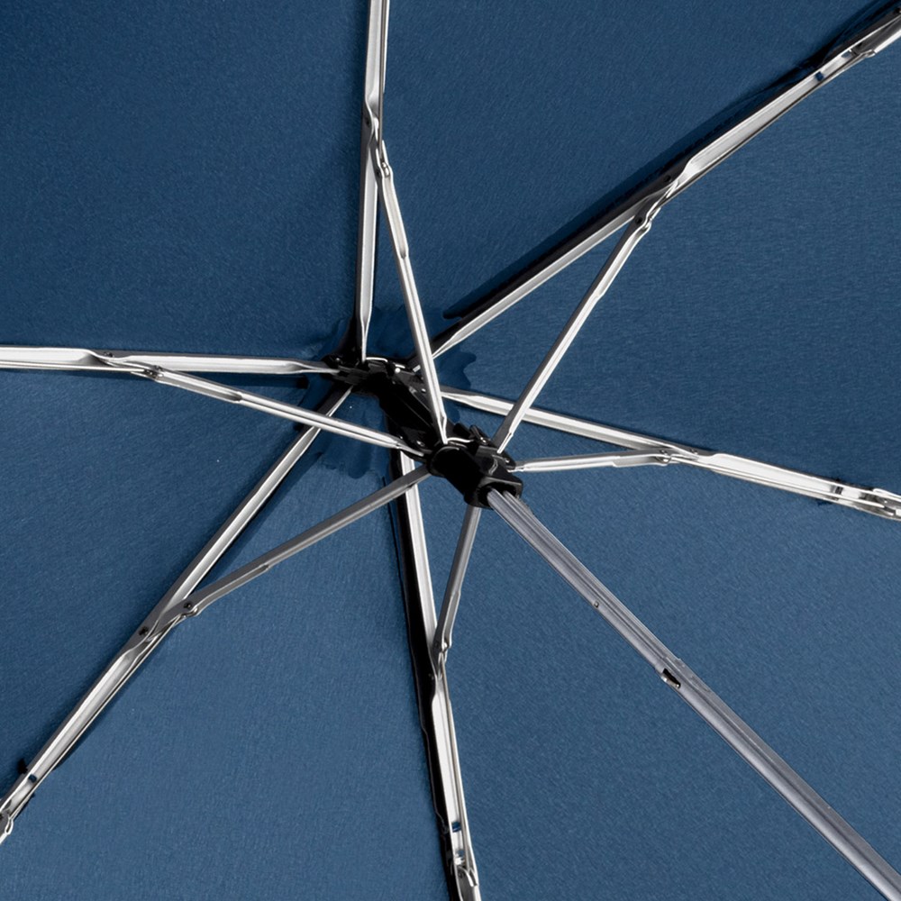 Ultraleichter Handöffner-Taschenschirm im praktischen Tragefutteral mit Karabinerhaken Hochwertiges Windproof-PLUS-System für eine maximale Gestell-Flexibilität bei stärkeren Windböen, verchromter Stahlstock, extra leichter Bezug, flacher Soft-Touch-Griff mit Werbeanbringungsmöglichkeit, Tragefutteral mit praktischem Karabinerhaken zur Befestigung an Rucksack oder Tasche, handtaschentauglich durch extrem leichtes Gewicht, platzsparend durch superflache Ausführung