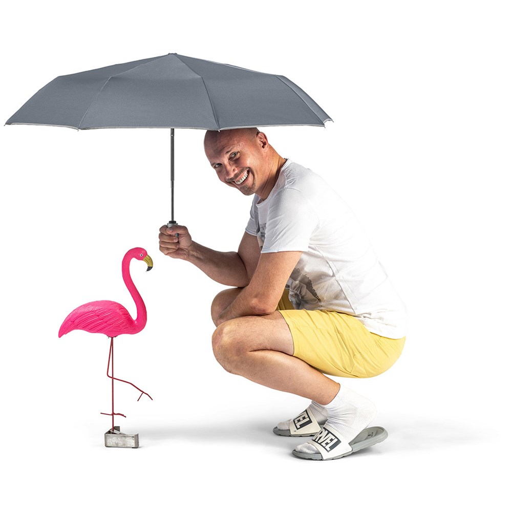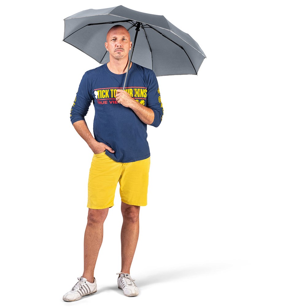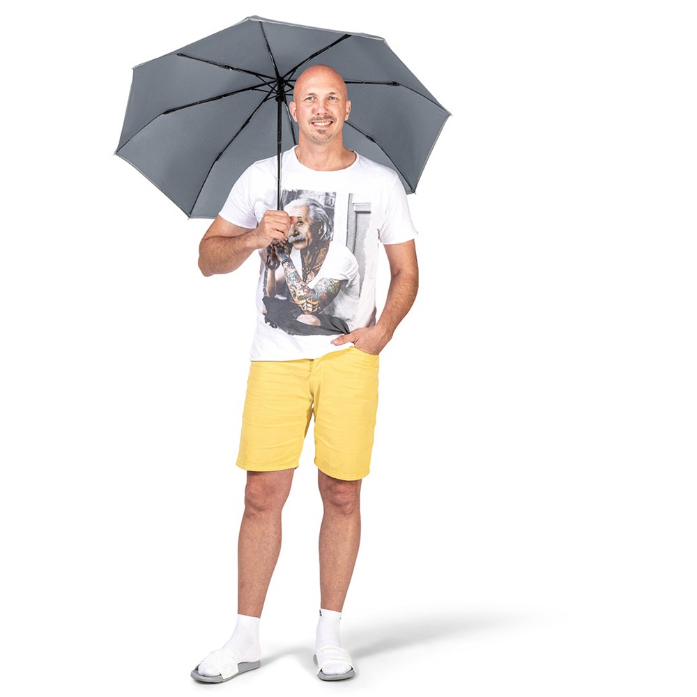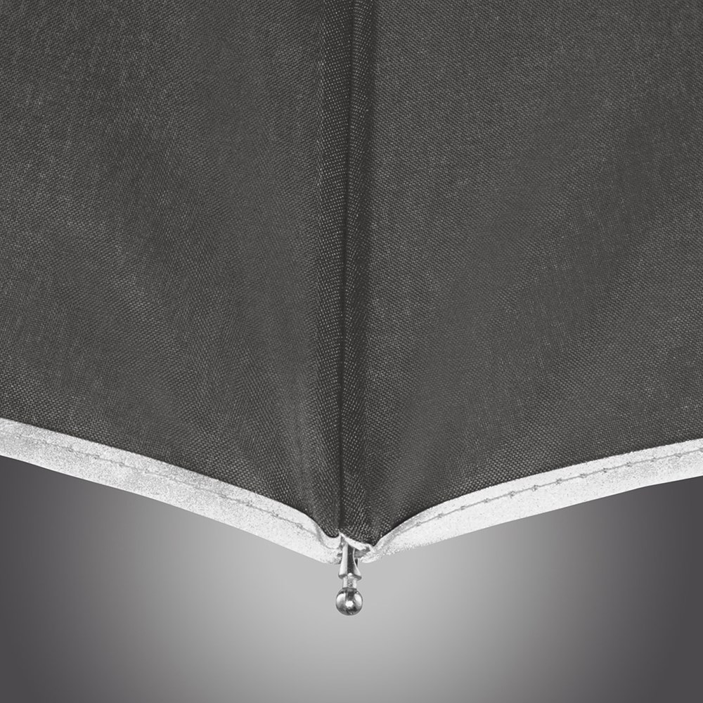 Markanter Doppelautomatik-Taschenschirm in Übergröße mit modisch reflektierender Paspelierung Komfortable Doppelautomatik-Funktion zum schnellen Öffnen und Schließen, hochwertiges Windproof-PLUS-System für eine maximale Gestell-Flexibilität bei stärkeren Windböen, flexible Fiberglasschienen, verchromter Stahlstock, Bezug mit modischer Reflexpaspel in silber, Griff in Alu-Finish mit integrierter Auslösetaste und Werbeanbringungsmöglichkeit