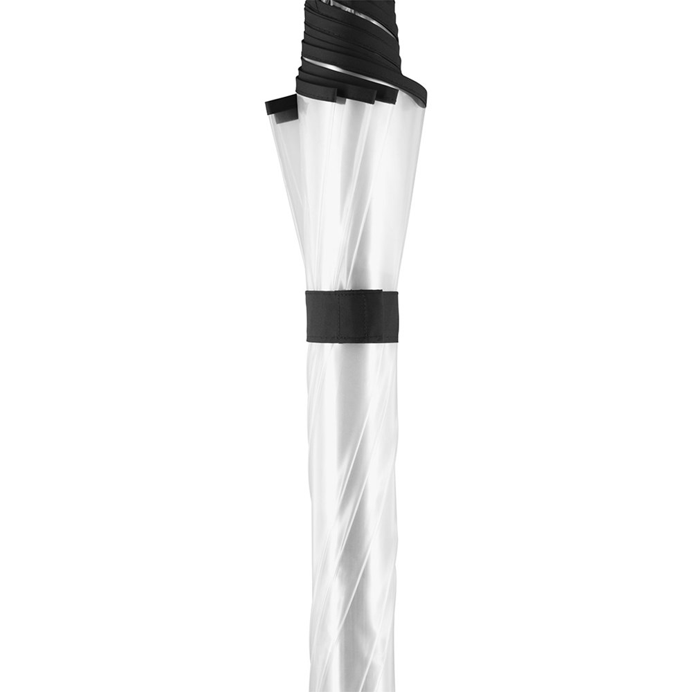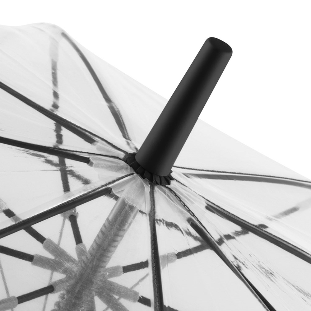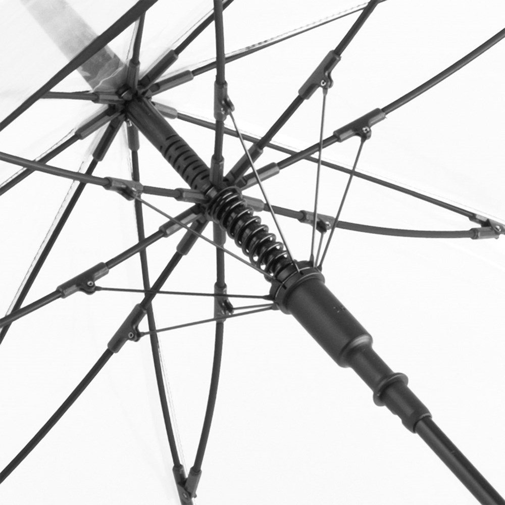 Ansprechender Automatik-Stockschirm mit transparentem Bezug und farbigen Details Komfortable Automatik-Funktion zum schnellen Öffnen, hochwertiges Windproof-PLUS-System für eine maximale Gestell-Flexibilität bei stärkeren Windböen, flexible Fiberglasschienen, farblich aufeinander abgestimmte Design-Elemente, handsympathischer Soft-Touch-Rundhakengriff mit integrierter Auslösetaste und Werbeanbringungsmöglichkeit, höherer Korrosionsschutz durch schwarze Galvanisierung des Stahlstocks