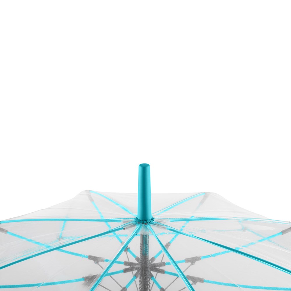 Ansprechender Automatik-Stockschirm mit transparentem Bezug und farbigen Details Komfortable Automatik-Funktion zum schnellen Öffnen, hochwertiges Windproof-PLUS-System für eine maximale Gestell-Flexibilität bei stärkeren Windböen, flexible Fiberglasschienen, farblich aufeinander abgestimmte Design-Elemente, handsympathischer Soft-Touch-Rundhakengriff mit integrierter Auslösetaste und Werbeanbringungsmöglichkeit, höherer Korrosionsschutz durch schwarze Galvanisierung des Stahlstocks